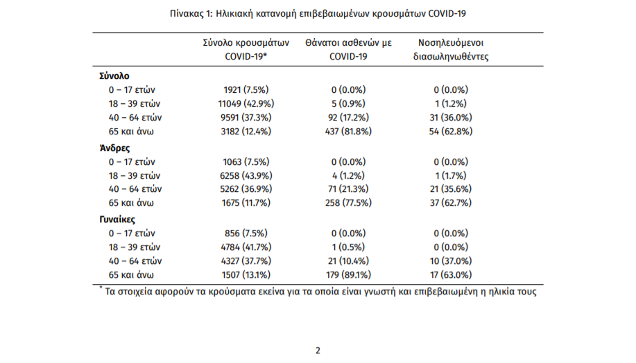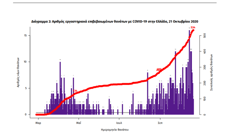 Τέλος, έχουμε 6 ακόμα καταγεγραμμένους θανάτους και 534 θανάτους συνολικά στη χώρα. 201 (37.6%) γυναίκες και οι υπόλοιποι άνδρες. Η διάμεση ηλικία των θανόντων συμπολιτών μας ήταν τα 79 έτη και το 96.3% είχε κάποιο υποκείμενο νόσημα ή/και ηλικία 70 ετών και άνω.