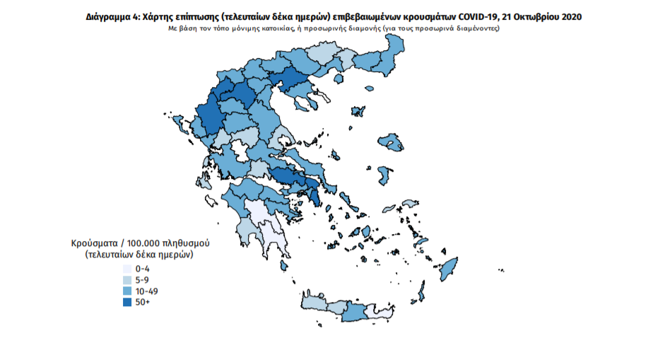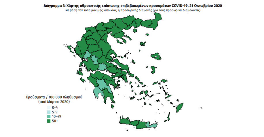 Ο χάρτης αποτυπώνει τη γεωγραφική κατανομή των συνολικών κρουσμάτων COVID-19 (από την αρχή της επιδημίας) ανά Περιφερειακή Ενότητα της χώρας, με βάση την δηλωθείσα διεύθυνση μόνιμης κατοικίας του ασθενούς, ή τη διεύθυνση προσωρινής διαμονής για τους τουρίστες και άλλους προσωρινά διαμένοντες στην Ελλάδα. Συμπεριλαμβάνονται τόσο κρούσματα με ιστορικό ταξιδίου (“εισαγόμενα”) όσο και κρούσματα με πιθανή εγχώρια μετάδοση.