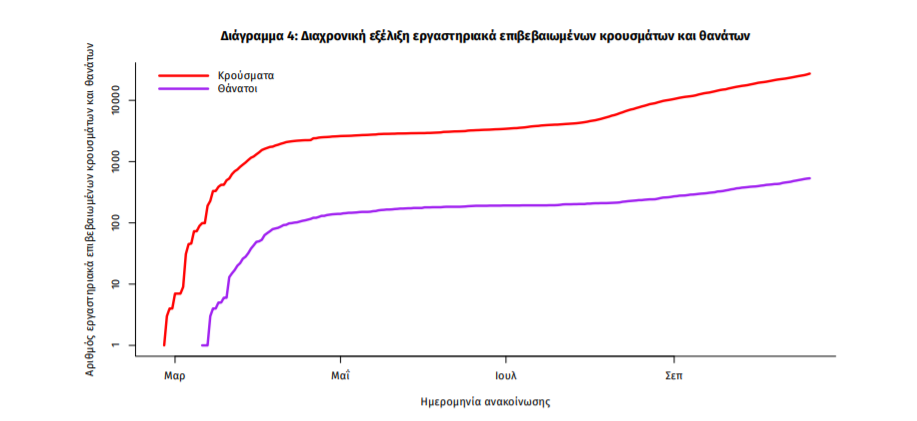 Η διαχρονική εξέλιξη των συνολικών κρουσμάτων και συνολικού αριθμού των θανάτων ασθενών COVID-19 παρουσιάζεται στο ακόλουθο διάγραμμα (σε λογαριθμική κλίμακα).