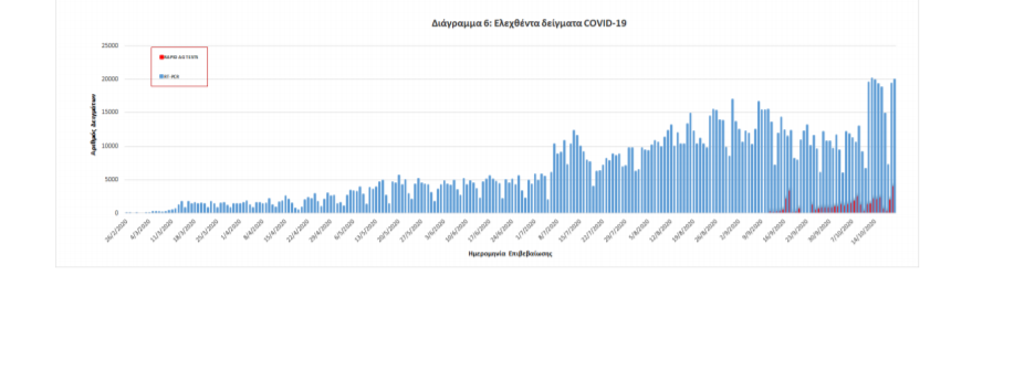 Δείγματα που έχουν ελεγχθεί: Από την 1η Ιανουαρίου 2020 μέχρι σήμερα, στα εργαστήρια που διενεργούν ελέγχους για τον νέο κορωνοϊό (SARS-CoV-2) και που δηλώνουν συστηματικά στον ΕΟΔΥ το σύνολο των δειγμάτων που ελέγχουν, έχουν συνολικά ελεγχθεί 1588713 κλινικά δείγματα ενώ από Μονάδες Υγείας και Κλιμάκια του ΕΟΔΥ που διενεργούν ελέγχους Rapid Ag έχουν ελεγχθεί 41827 δείγματα.