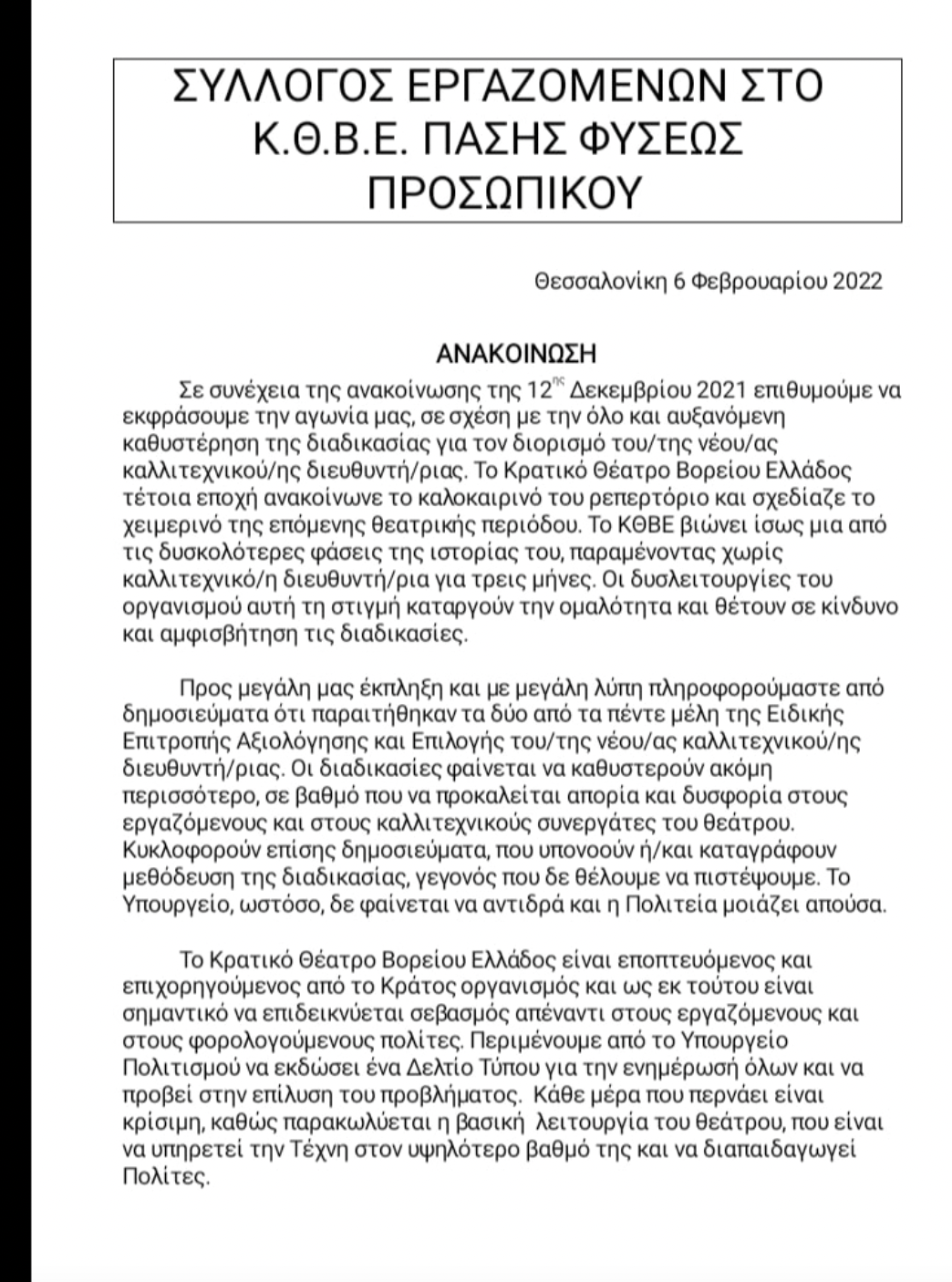 Στο μεταξύ επιστολή ανησυχίας για τις εξελίξεις εξέδωσαν οι εργαζόμενοι του θεάτρου.