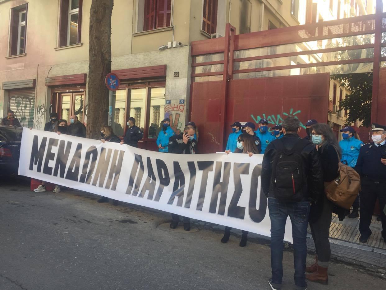 Σε πανό που ανήρτησαν έξω από το κτίριο του ΥΠΠΟΑ αναγράφεται το σύνθημα «Μενδώνη παραιτήσου». Ανάμεσα στους διαδηλωτές είναι ο πρόεδρος του Πειθαρχικού Συμβουλίου του Σωματείου Ελλήνων Ηθοποιών (ΣΕΗ) Πασχάλης Τσαρούχας καθώς και ο κοινοβουλευτικός εκπρόσωπος του ΜέΡΑ25 Κλέων Γρηγοριάδης.