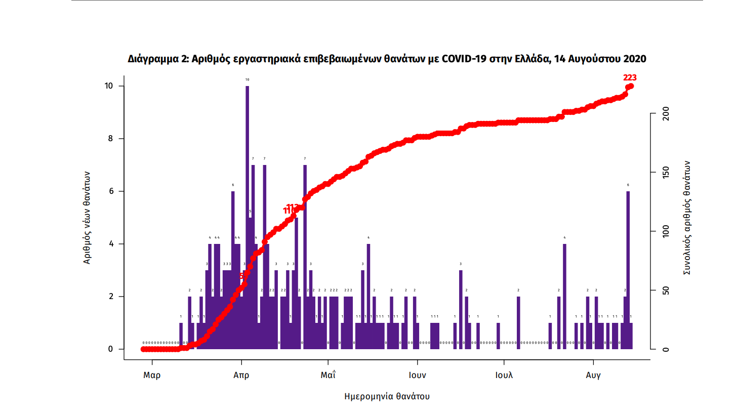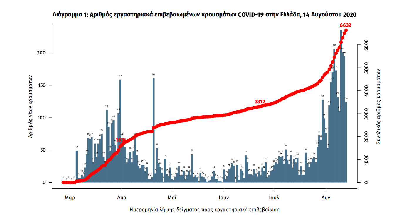 Τα στοιχεία που παρουσιάζονται αφορούν περιστατικά από την επιδημιολογική επιτήρηση της νόσου από το νέο κορωνοϊό (COVID19), με βάση τα δεδομένα που έχουν δηλωθεί στον ΕΟΔΥ και καταγραφεί μέχρι τις 14 Αυγούστου 2020 (ώρα 15:00). Τα νέα εργαστηριακά επιβεβαιωμένα κρούσματα της νόσου είναι 254, εκ των οποίων τα 20 εντοπίστηκαν κατόπιν ελέγχων στις πύλες εισόδου της χώρας. Ο συνολικός αριθμός των κρουσμάτων ανέρχεται σε 6632 (ημερήσια μεταβολή +4.0%), εκ των οποίων 55.0% άνδρες. 1 Οι νέοι θάνατοι ασθενών με COVID-19 είναι 2, ενώ από την έναρξη της επιδημίας έχουν καταγραφεί συνολικά 223 θάνατοι. Η μέση ηλικία των ασθενών που απεβίωσαν είναι 77 έτη. Ο αριθμός των ασθενών που νοσηλεύονται διασωληνωμένοι είναι 22 (68.2% άνδρες). Η ημερήσια κατανομή των επιβεβαιωμένων κρουσμάτων είναι η ακόλουθη (η γραμμή παριστάνει την συνολική, αθροιστική κατανομή των κρουσμάτων).