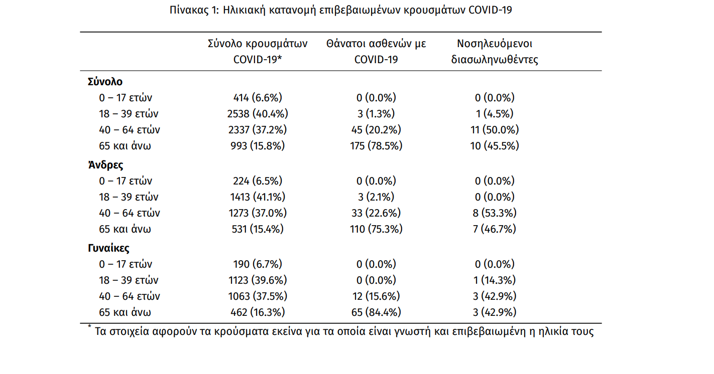 Τέλος, έχουμε 2 ακόμα καταγεγραμμένους θανάτους και 223 θανάτους συνολικά στη χώρα. 77 (34.5%) γυναίκες και οι υπόλοιποι άνδρες. Η διάμεση ηλικία των θανόντων συμπολιτών μας ήταν τα 77 έτη και το 96.0% είχε κάποιο υποκείμενο νόσημα ή/και ηλικία 70 ετών και άνω.
