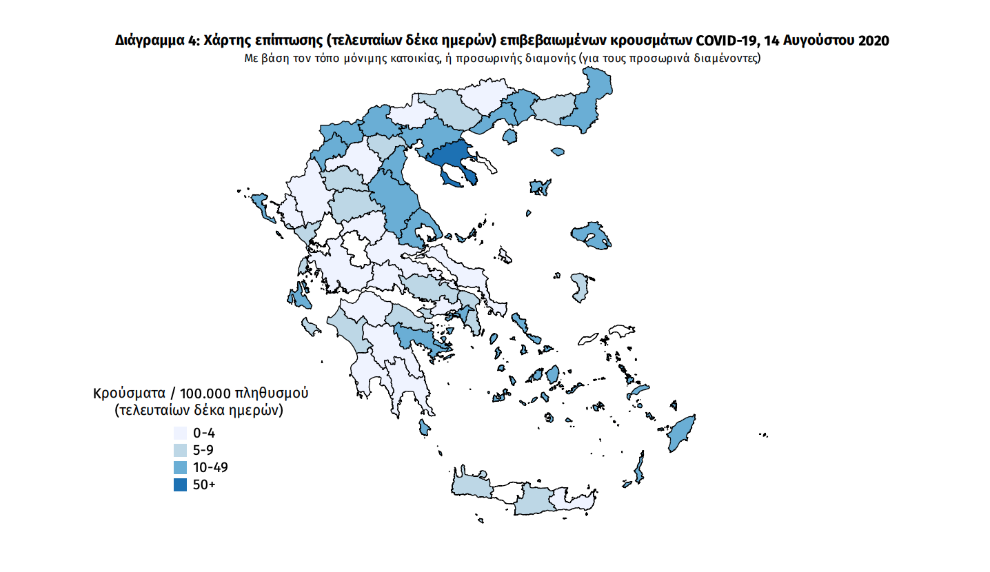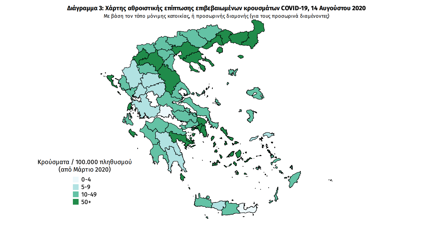 Ο χάρτης αποτυπώνει τη γεωγραφική κατανομή των συνολικών κρουσμάτων COVID-19 (από την αρχή της επιδημίας) ανά Περιφερειακή Ενότητα της χώρας, με βάση την δηλωθείσα διεύθυνση μόνιμης κατοικίας του ασθενούς, ή τη διεύθυνση προσωρινής διαμονής για τους τουρίστες και άλλους προσωρινά διαμένοντες στην Ελλάδα. Συμπεριλαμβάνονται τόσο κρούσματα με ιστορικό ταξιδίου (“εισαγόμενα”) όσο και κρούσματα με πιθανή εγχώρια μετάδοση.
