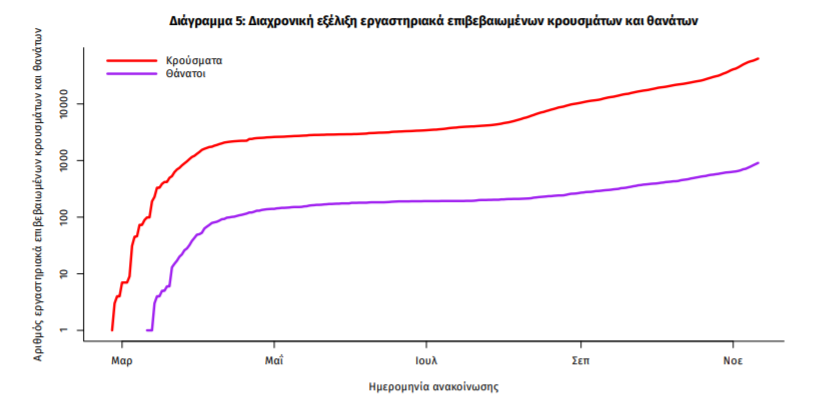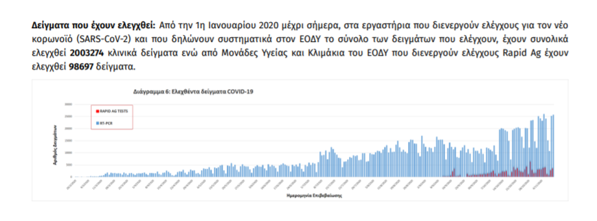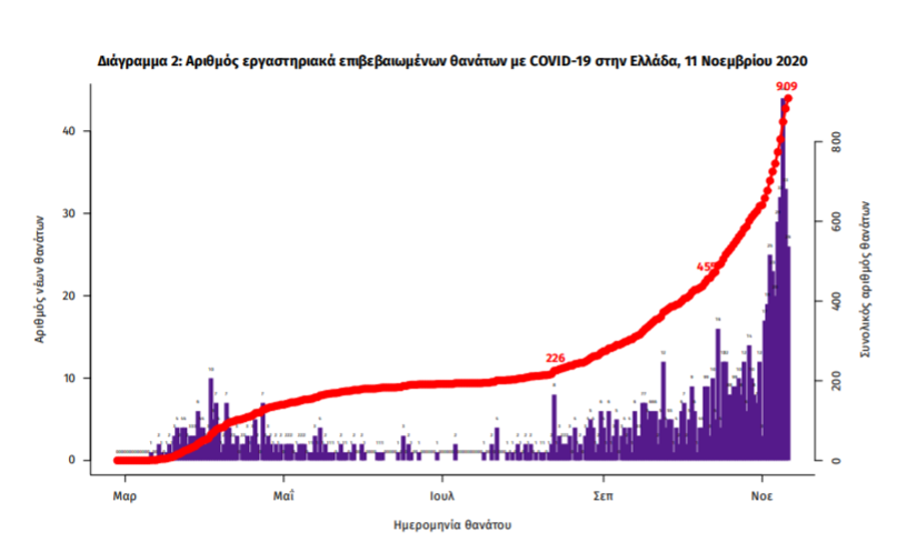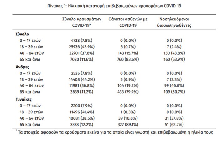 Τέλος, έχουμε 43 ακόμα καταγεγραμμένους θανάτους και 909 θανάτους συνολικά στη χώρα. 369 (40.6%) γυναίκες και οι υπόλοιποι άνδρες. Η διάμεση ηλικία των θανόντων συμπολιτών μας ήταν τα 79 έτη και το 96.7% είχε κάποιο υποκείμενο νόσημα ή/και ηλικία 70 ετών και άνω.