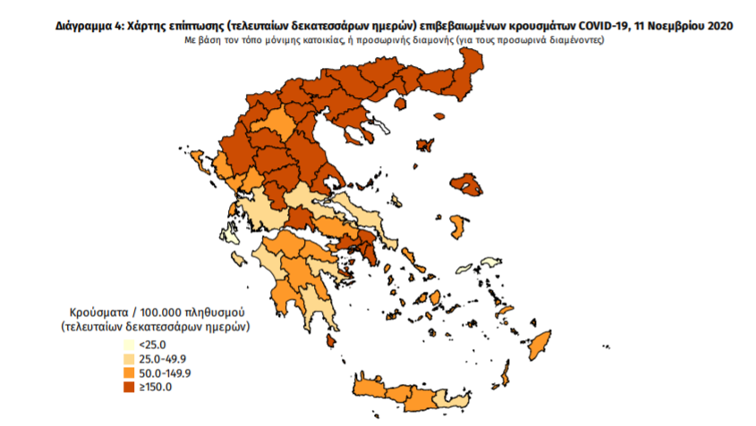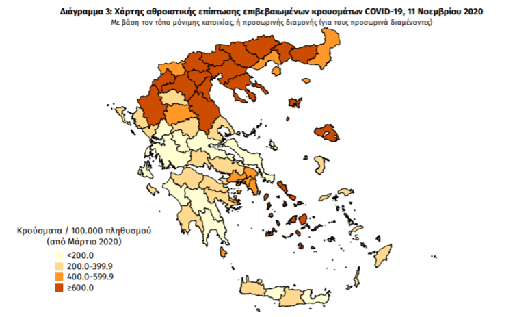 Ο χάρτης αποτυπώνει τη γεωγραφική κατανομή των συνολικών κρουσμάτων COVID-19 (από την αρχή της επιδημίας) ανά Περιφερειακή Ενότητα της χώρας, με βάση την δηλωθείσα διεύθυνση μόνιμης κατοικίας του ασθενούς, ή τη διεύθυνση προσωρινής διαμονής για τους τουρίστες και άλλους προσωρινά διαμένοντες στην Ελλάδα. Συμπεριλαμβάνονται τόσο κρούσματα με ιστορικό ταξιδίου (“εισαγόμενα”) όσο και κρούσματα με πιθανή εγχώρια μετάδοση