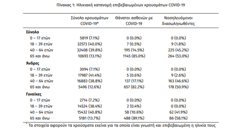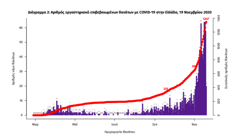 Τέλος, έχουμε 59 ακόμα καταγεγραμμένους θανάτους και 1347 θανάτους συνολικά στη χώρα. 547 (40.6%) γυναίκες και οι υπόλοιποι άνδρες. Η διάμεση ηλικία των θανόντων συμπολιτών μας ήταν τα 80 έτη και το 97.2% είχε κάποιο υποκείμενο νόσημα ή/και ηλικία 70 ετών και άνω.