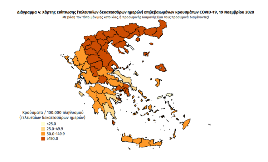 Ο χάρτης αποτυπώνει τη γεωγραφική κατανομή των συνολικών κρουσμάτων COVID-19 (από την αρχή της επιδημίας) ανά Περιφερειακή Ενότητα της χώρας, με βάση την δηλωθείσα διεύθυνση μόνιμης κατοικίας του ασθενούς, ή τη διεύθυνση προσωρινής διαμονής για τους τουρίστες και άλλους προσωρινά διαμένοντες στην Ελλάδα. Συμπεριλαμβάνονται τόσο κρούσματα με ιστορικό ταξιδίου (“εισαγόμενα”) όσο και κρούσματα με πιθανή εγχώρια μετάδοση
