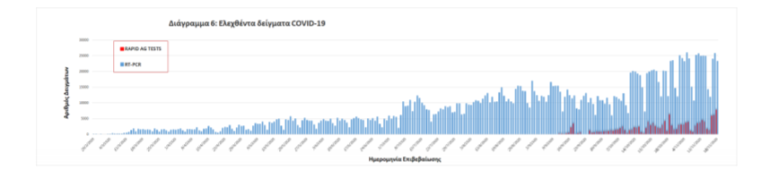 Από την 1η Ιανουαρίου 2020 μέχρι σήμερα, στα εργαστήρια που διενεργούν ελέγχους για τον νέο κορωνοϊό (SARS-CoV-2) και που δηλώνουν συστηματικά στον ΕΟΔΥ το σύνολο των δειγμάτων που ελέγχουν, έχουν συνολικά ελεγχθεί 2177279 κλινικά δείγματα ενώ από Μονάδες Υγείας και Κλιμάκια του ΕΟΔΥ που διενεργούν ελέγχους Rapid Ag έχουν ελεγχθεί 133255 δείγματα.