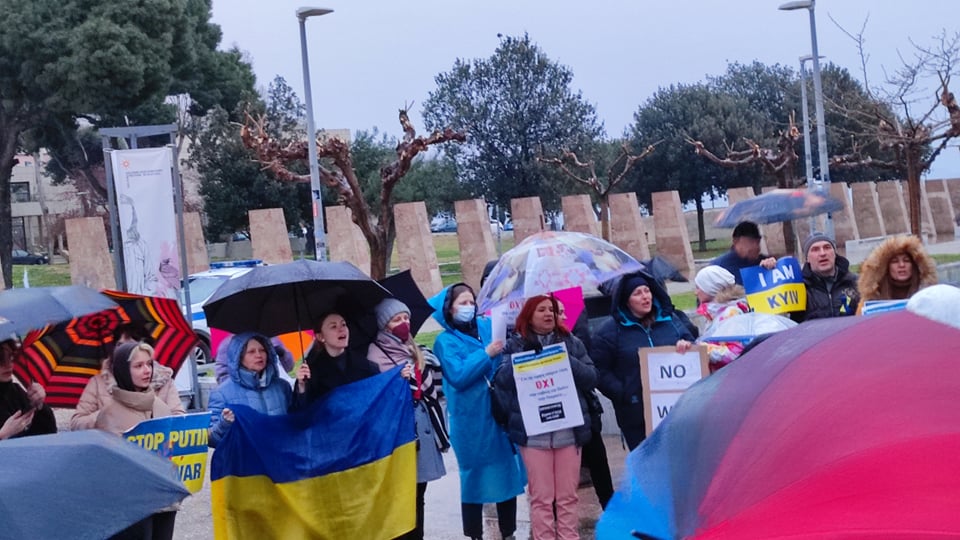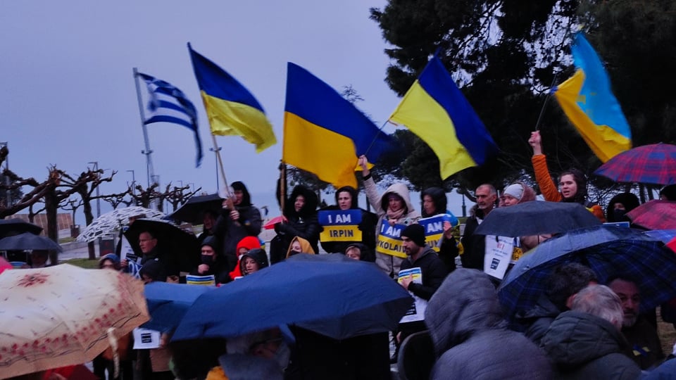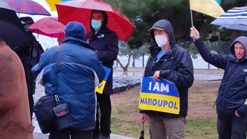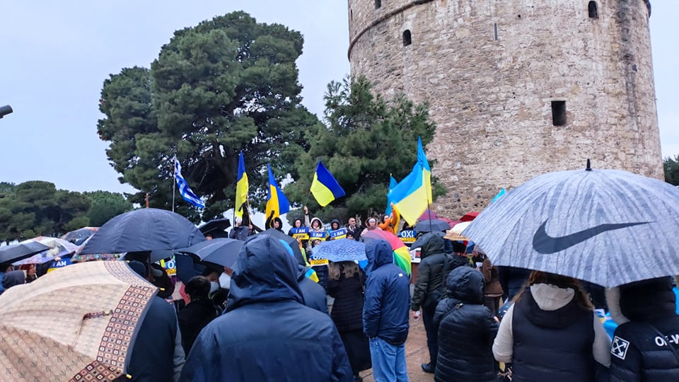 Κρατώντας σημαίες και πλακάτ με τα χρώματα της Ουκρανίας, εκφράζουν τη συμπαράσταση τους στον Ουκρανικό λαό και ζητούν την άμεση αποχώρηση της Ρωσίας και το σταμάτημα του πολέμου. Την αντιπολεμική συγκέντρωση διοργάνωσε η “Πρωτοβουλία πολιτών Θεσσαλονίκης ενάντια στην εισβολή και στον πόλεμο στην Ουκρανία”.