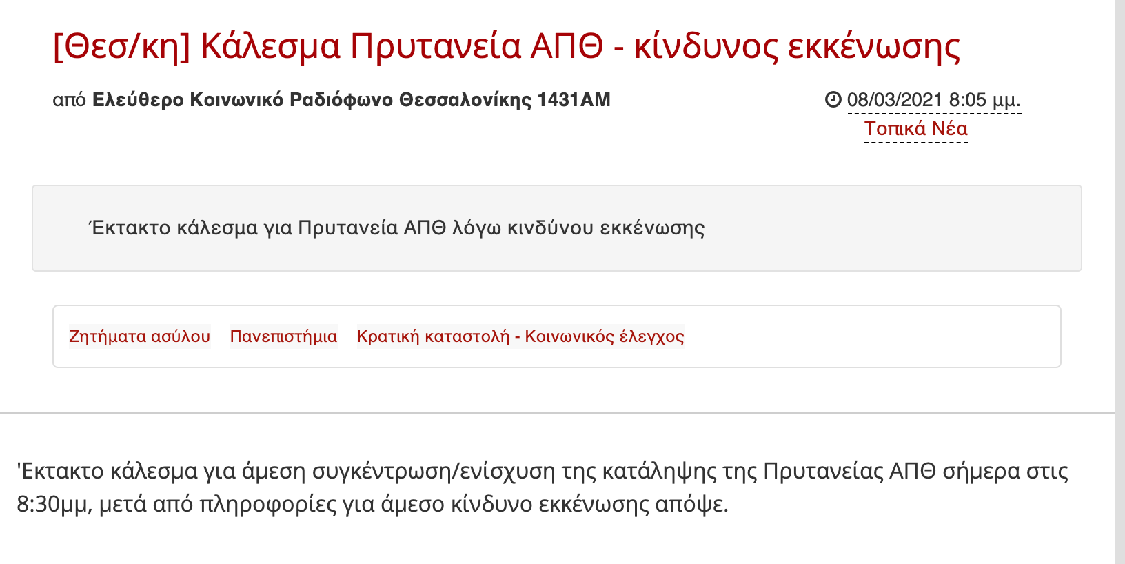 ”Μέσα από έγκυρες πληροφορίες η κατειλημμένη Πρυτανεία διατρέχει κίνδυνο εκκένωσης,ιδίως τις επόμενες ώρες που πέφτουν πάνω στην απαγόρευση κυκλοφορίας. Δεδομένου αυτού, καλούμε σε στήριξη της κατάληψης πριν αρχίσει η απαγόρευση κυκλοφορίας.”