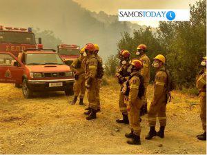 Στη μάχη για την αντιμετώπιση της μεγάλης δασικής πυρκαγιάς που από χθες, Πέμπτη 15 Ιουλίου, το μεσημέρι κατακαίει την κεντρική-ανατολική Σάμο, ρίχτηκαν από το πρωί επίγειες και εναέριες δυνάμεις. Από εδάφους επιχειρούσαν όλη τη νύχτα 85 πυροσβέστες και εθελοντές δασοπυροσβέστες μαζί με εργαζόμενους.