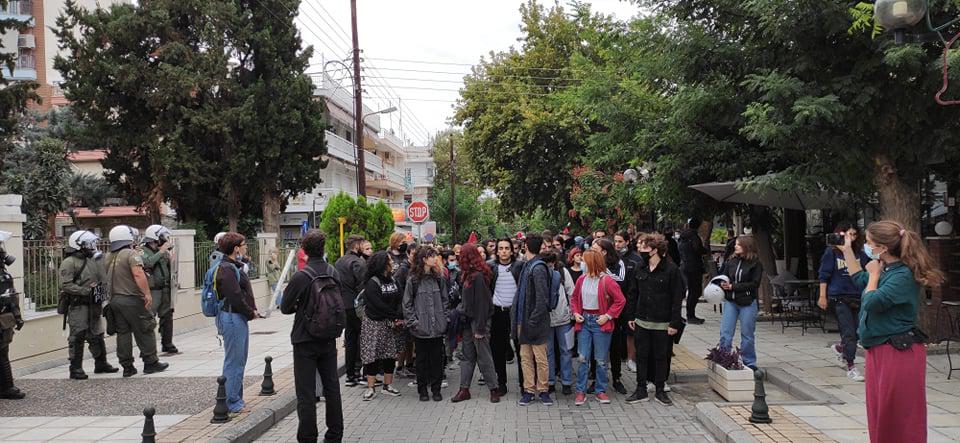 Οι συγκεντρωμένοι σταμάτησαν έξω από τα γραφεία της Διεύθυνσης Δευτεροβάθμιας Εκπαίδευσης Δυτικής Θεσσαλονίκης φωνάζοντας αντιφασιστικά συνθήματα.