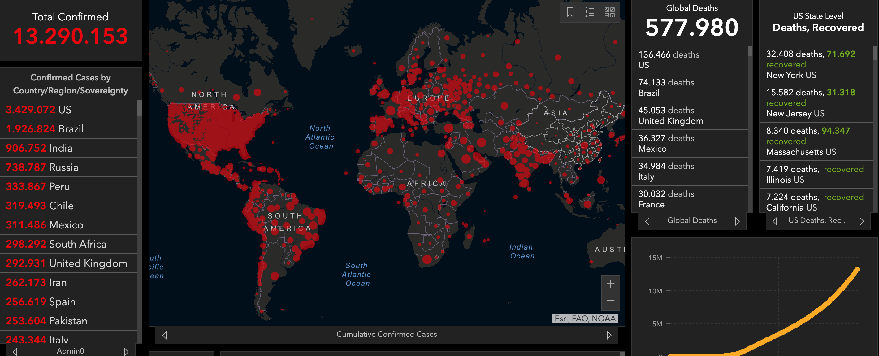 Περισσότερα από 13.290.000 κρούσματα της νόσου Covid-19 έχουν καταγραφεί επισήμως σε 196 χώρες και εδάφη από την έναρξη της επιδημίας, ενώ 7.096.000 άνθρωποι θεωρείται ότι έχουν αποθεραπευτεί.