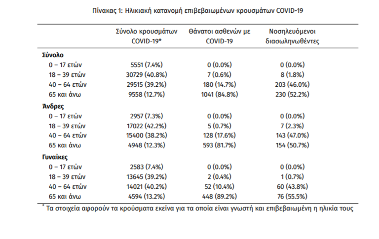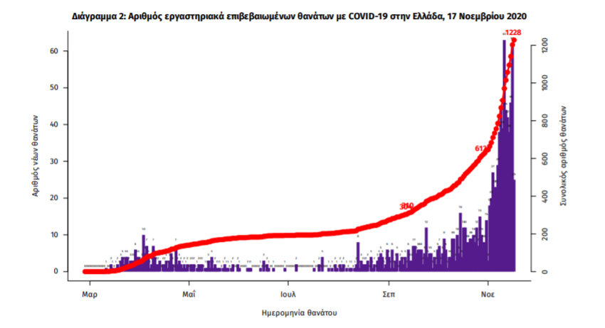 Τέλος, έχουμε 63 ακόμα καταγεγραμμένους θανάτους και 1228 θανάτους συνολικά στη χώρα. 502 (40.9%) γυναίκες και οι υπόλοιποι άνδρες. Η διάμεση ηλικία των θανόντων συμπολιτών μας ήταν τα 80 έτη και το 97.2% είχε κάποιο υποκείμενο νόσημα ή/και ηλικία 70 ετών και άνω.