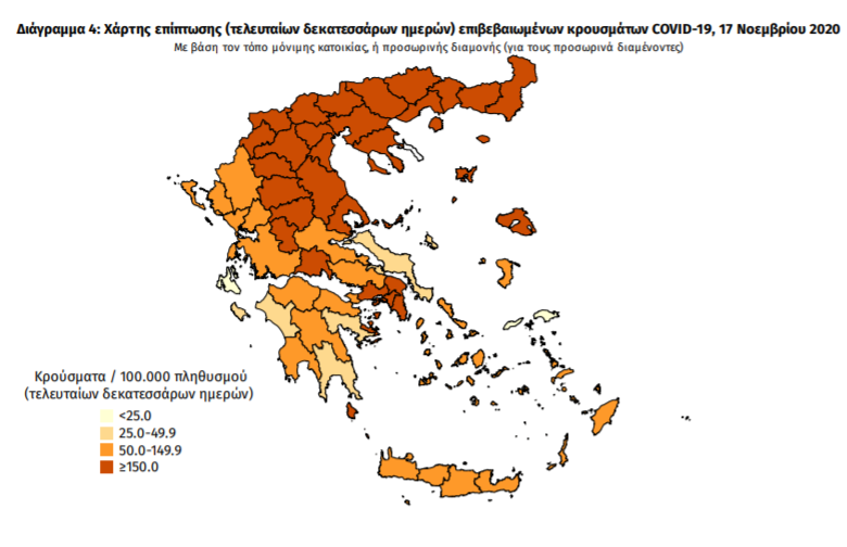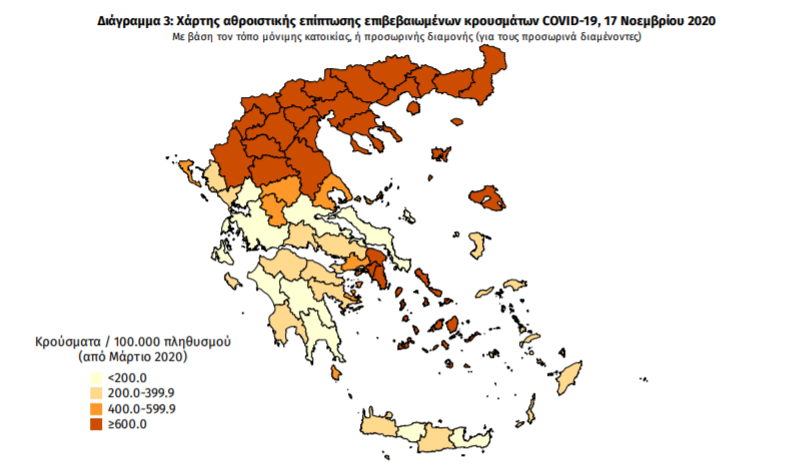Ο χάρτης αποτυπώνει τη γεωγραφική κατανομή των συνολικών κρουσμάτων COVID-19 (από την αρχή της επιδημίας) ανά Περιφερειακή Ενότητα της χώρας, με βάση την δηλωθείσα διεύθυνση μόνιμης κατοικίας του ασθενούς, ή τη διεύθυνση προσωρινής διαμονής για τους τουρίστες και άλλους προσωρινά διαμένοντες στην Ελλάδα. Συμπεριλαμβάνονται τόσο κρούσματα με ιστορικό ταξιδίου (“εισαγόμενα”) όσο και κρούσματα με πιθανή εγχώρια μετάδοση.