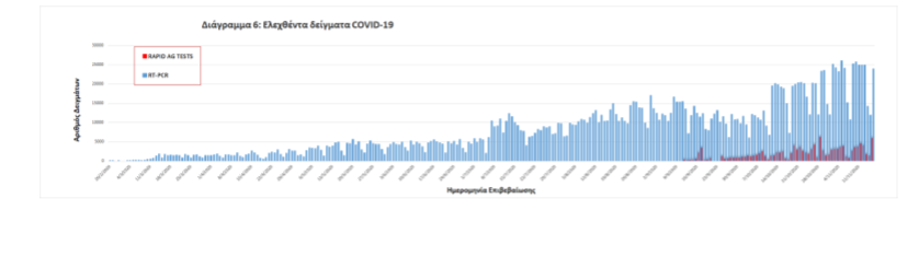 Από την 1η Ιανουαρίου 2020 μέχρι σήμερα, στα εργαστήρια που διενεργούν ελέγχους για τον νέο κορωνοϊό (SARS-CoV-2) και που δηλώνουν συστηματικά στον ΕΟΔΥ το σύνολο των δειγμάτων που ελέγχουν, έχουν συνολικά ελεγχθεί 2128189 κλινικά δείγματα ενώ από Μονάδες Υγείας και Κλιμάκια του ΕΟΔΥ που διενεργούν ελέγχους Rapid Ag έχουν ελεγχθεί 119497 δείγματα.