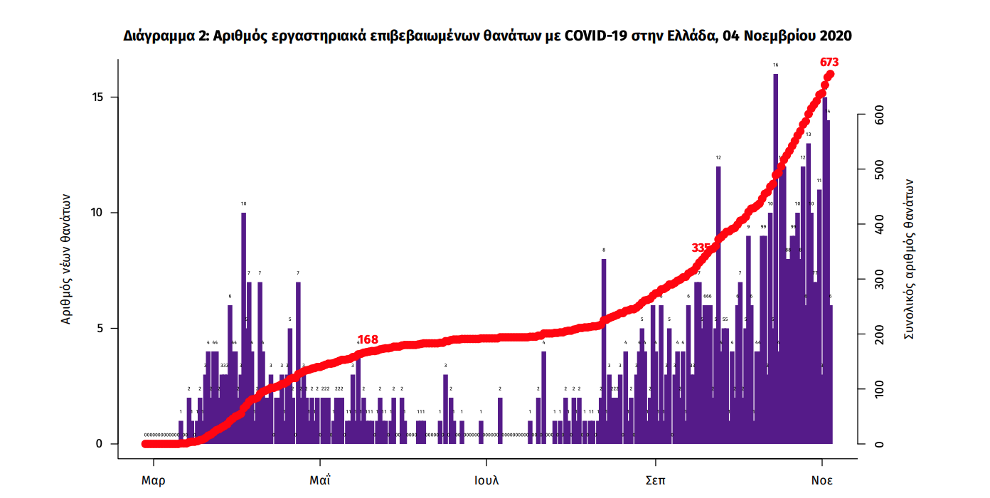 Τέλος, έχουμε 18 ακόμα καταγεγραμμένους θανάτους και 673 θανάτους συνολικά στη χώρα. 259 (38.5%) γυναίκες και οι υπόλοιποι άνδρες. Η διάμεση ηλικία των θανόντων συμπολιτών μας ήταν τα 79 έτη και το 96.4% είχε κάποιο υποκείμενο νόσημα ή/και ηλικία 70 ετών και άνω.