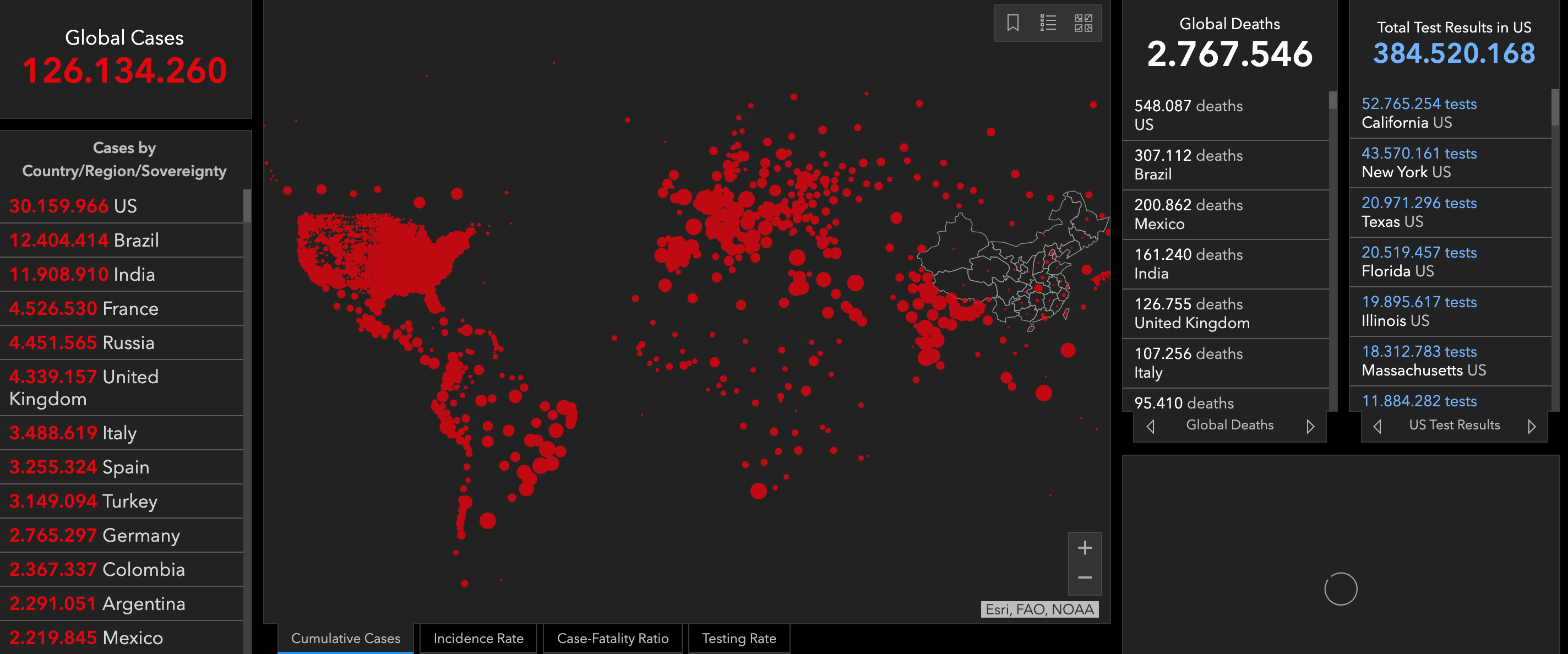 Ο Παγκόσμιος Οργανισμός Υγείας χαρακτήρισε το ξέσπασμα της COVID-19, πανδημία στις 11 Μαρτίου του 2020. Έως σήμερα, περισσότεροι από 126,02 εκατ. άνθρωποι έχουν μολυνθεί σε όλο τον κόσμο και περισσότεροι από 2,76 εκατ. έχουν χάσει τη ζωή τους, σύμφωνα με το Πανεπιστήμιο Τζονς Χόπκινς.