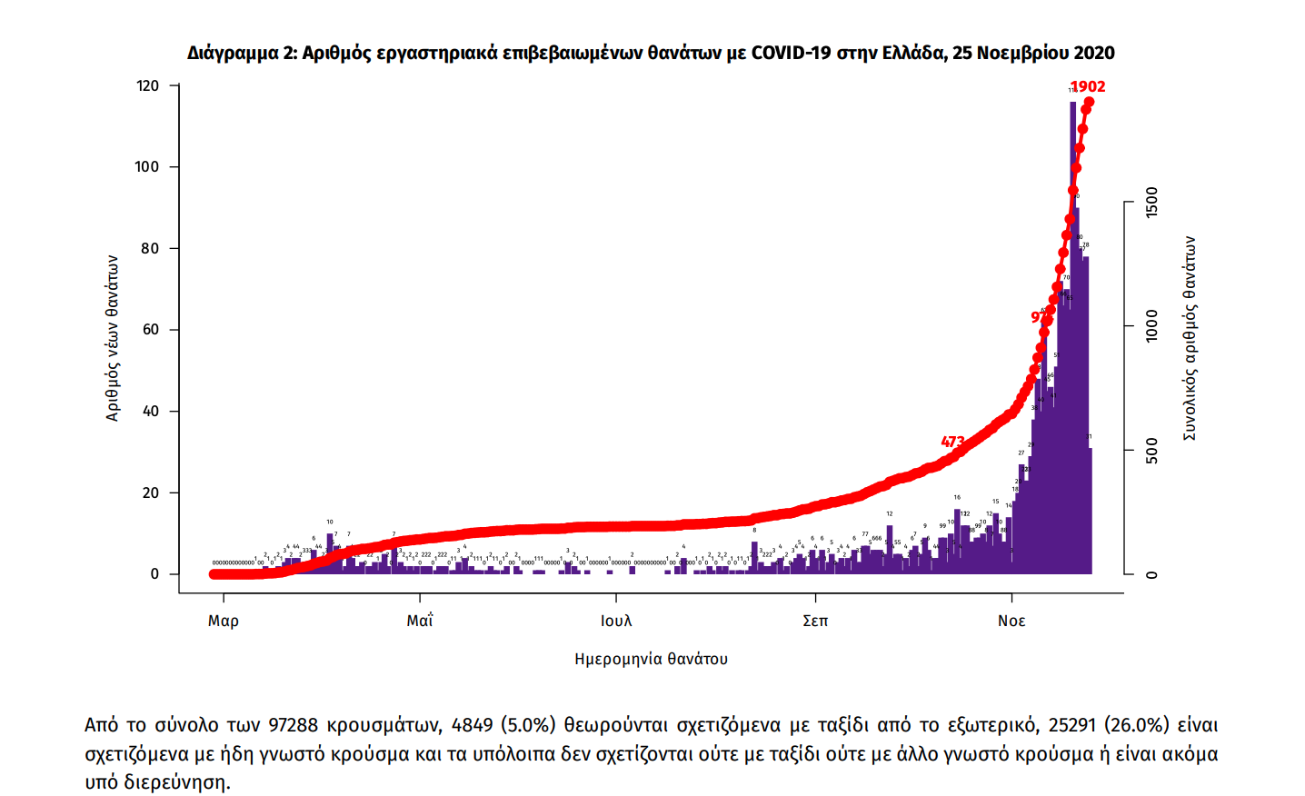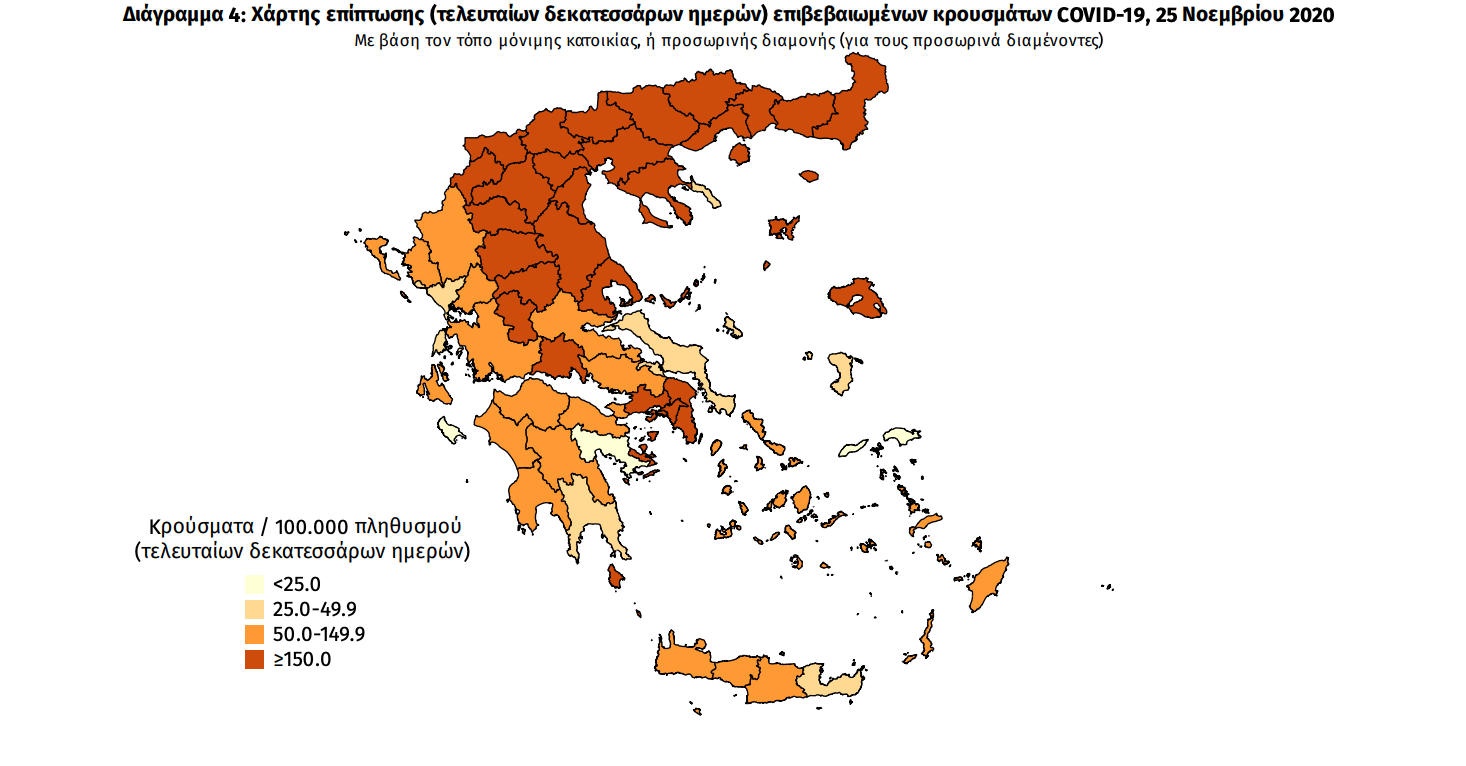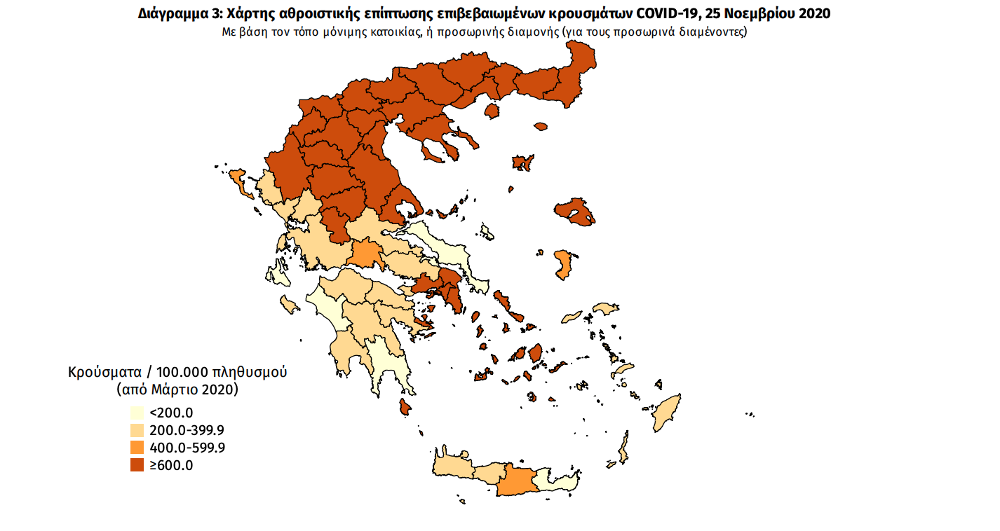 Τα στοιχεία που παρουσιάζονται αφορούν περιστατικά από την επιδημιολογική επιτήρηση της νόσου από το νέο κορωνοϊό (COVID19), με βάση τα δεδομένα που έχουν δηλωθεί στον ΕΟΔΥ και καταγραφεί μέχρι τις 25 Νοεμβρίου 2020 (ώρα 15:00). Τα νέα εργαστηριακά επιβεβαιωμένα κρούσματα της νόσου είναι 2152, εκ των οποίων 6 εντοπίστηκαν κατόπιν ελέγχων στις πύλες εισόδου της χώρας. Ο συνολικός αριθμός των κρουσμάτων ανέρχεται σε 97288 (ημερήσια μεταβολή +2.3%), εκ των οποίων 53.2% άνδρες. 1 Οι νέοι θάνατοι ασθενών με COVID-19 είναι 87, ενώ από την έναρξη της επιδημίας έχουν καταγραφεί συνολικά 1902 θάνατοι.Η διάμεση ηλικία των ασθενών που απεβίωσαν είναι 80 έτη.