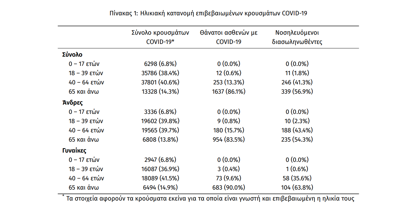 Από το σύνολο των 97288 κρουσμάτων, 4849 (5.0%) θεωρούνται σχετιζόμενα με ταξίδι από το εξωτερικό, 25291 (26.0%) είναι σχετιζόμενα με ήδη γνωστό κρούσμα και τα υπόλοιπα δεν σχετίζονται ούτε με ταξίδι ούτε με άλλο γνωστό κρούσμα ή είναι ακόμα υπό διερεύνηση. Η μέση ηλικία των κρουσμάτων είναι 42 έτη (εύρος 0 έως 104 ετών), ενώ η μέση ηλικία των θανάτων είναι 80 έτη (εύρος 25 έως 103 ετών). Η ηλικιακή κατανομή των (α) συνολικών κρουσμάτων, (β) των περιστατικών που κατέληξαν σε θάνατο και (γ) των ασθενών που νοσηλεύονται διασωληνωμένοι, είναι η ακόλουθη: