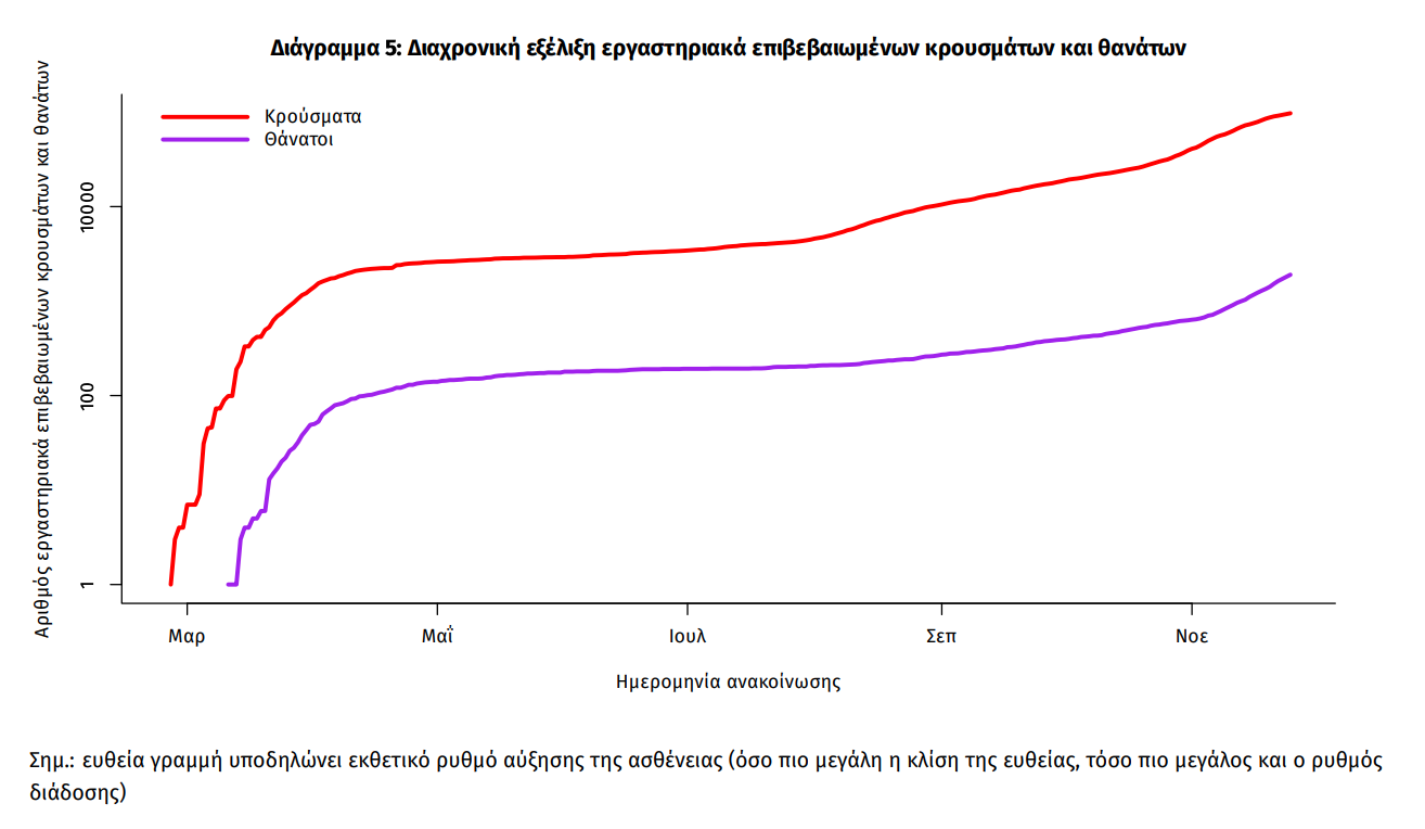 Η διαχρονική εξέλιξη των συνολικών κρουσμάτων και συνολικού αριθμού των θανάτων ασθενών COVID-19 παρουσιάζεται στο ακόλουθο διάγραμμα (σε λογαριθμική κλίμακα).