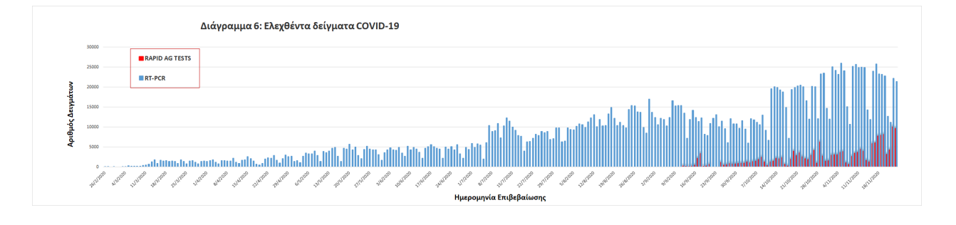 Δείγματα που έχουν ελεγχθεί: Από την 1η Ιανουαρίου 2020 μέχρι σήμερα, στα εργαστήρια που διενεργούν ελέγχους για τον νέο κορωνοϊό (SARS-CoV-2) και που δηλώνουν συστηματικά στον ΕΟΔΥ το σύνολο των δειγμάτων που ελέγχουν, έχουν συνολικά ελεγχθεί 2290659 κλινικά δείγματα ενώ από Μονάδες Υγείας και Κλιμάκια του ΕΟΔΥ που διενεργούν ελέγχους Rapid Ag έχουν ελεγχθεί 176486 δείγματα.