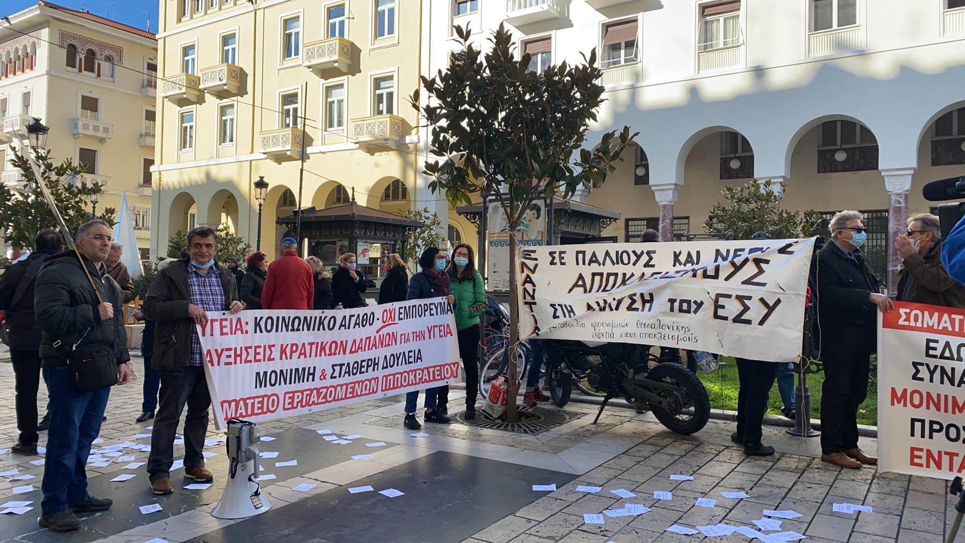 Συγκέντρωση διαμαρτυρίας πραγματοποιήσαν υγειονομικοί της Θεσσαλονίκης το πρωί της Τετάρτης στο πλαίσιο της 24ωρης απεργίας της ΠΟΕΔΗΝ.