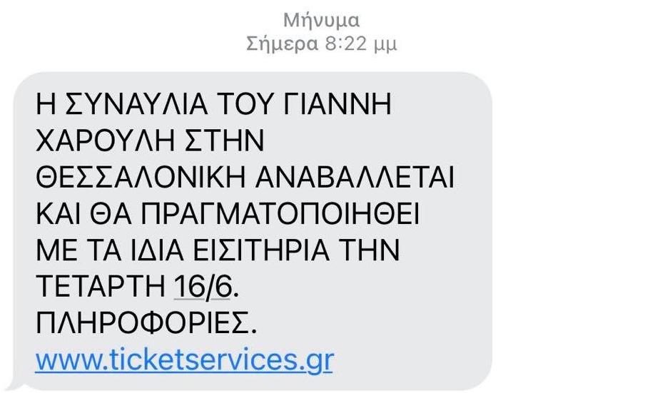 Απόψε το βράδυ στη Θεσσαλονίκη, οι διοργανωτές οδηγήθηκαν αναγκαστικά στη μετάθεση της συναυλίας του Γιάννη Χαρούλη (που θα ήταν και η πρώτη μεγάλη του φετινού καλοκαιριού) γιατί ήταν αδύνατον να καθαριστούν για τρίτη φορά το ίδιο απόγευμα όλα τα καθίσματα στο θέατρο Γης αλλά και επειδή υπήρχε σοβαρή πιθανότητα βροχής και κατά τη διάρκεια της εκδήλωσης η οποία ίσως δημιουργούσε πρόβλημα συνωστισμού στην έξοδο από το χώρο.