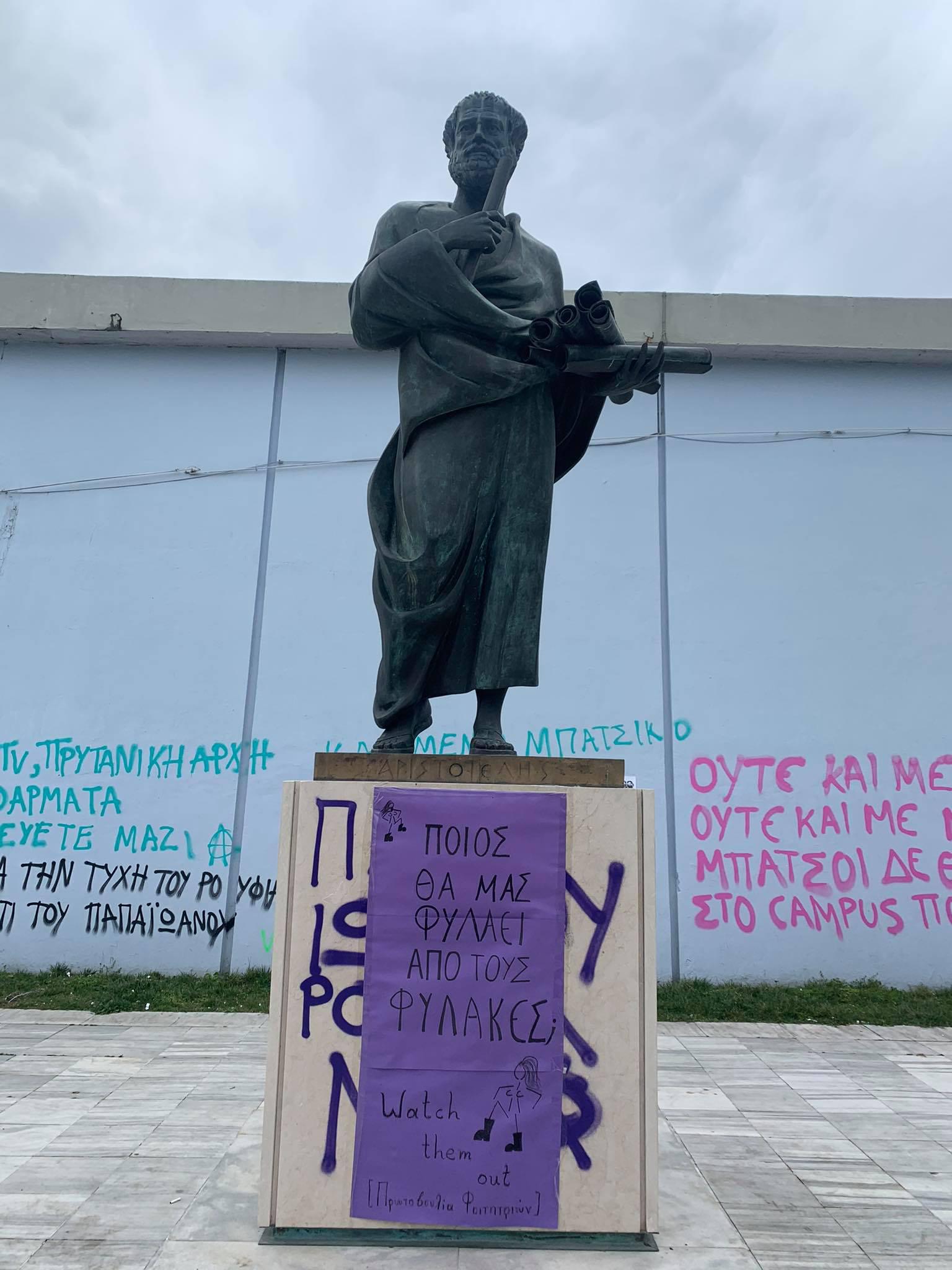 Αργά το απόγευμα της Δευτέρας πληροφορηθήκαμε το ενδεχόμενο αστυνομικής εκκένωσης από τις δυνάμεις καταστολής της Κατάληψης της Πρυτανείας. Παράλληλα, μάθαμε ότι στη Θεσσαλονίκη ανέβηκαν αύρες από την Αθήνα, ώστε να χρησιμοποιηθούν σε μελλοντική μαζική καταστολή των διαδηλωτών/τριών. Αργότερα, ενώ πραγματοποιούνταν η συνέλευση μας είδαμε τις αστυνομικές δυνάμεις να περικυκλώνουν τις εισόδους και να προετοιμάζονται για την αστυνομική εκκένωση. Κλούβες των ματ, μηχανές και οι νεοφερμένες αύρες απέκλεισαν κάθε είσοδο. Πλήθος κόσμου παρέμεινε μέσα στο κτήριο ως περιφρούρηση, ενώ γρήγορα συγκεντρώθηκε κόσμος απ’ έξω. Μετά από δύο ώρες σύσσωμες οι αστυνομικές δυνάμεις αποχώρησαν χωρίς καν να επιχειρήσουν τον σκοπό για τον οποίο ήρθαν. Η κινητοποίηση της ένοπλης συμμορίας της Ελ.Ας για την ώρα φαίνεται να έχει αποτύχει. Είμαστε, όμως, αντιμέτωποι με ένα οργανωμένο κρατικό σχέδιο καταστολής των φοιτητικών και κοινωνικών αντιστάσεων, μια συντονισμένη επιχείρηση του Υπουργείου Προστασίας να εκκενώσει την Κατάληψη Πρυτανείας. Καλούμε άμεσα κόσμο να προσεγγίσει και να στηρίξει την Κατειλημμένη Πρυτανεία, καθώς θεωρούμε ότι το ενδεχόμενο νέας αστυνομικής επιχείρησης τις επόμενες ώρες παραμένει αρκετά πιθανό.
