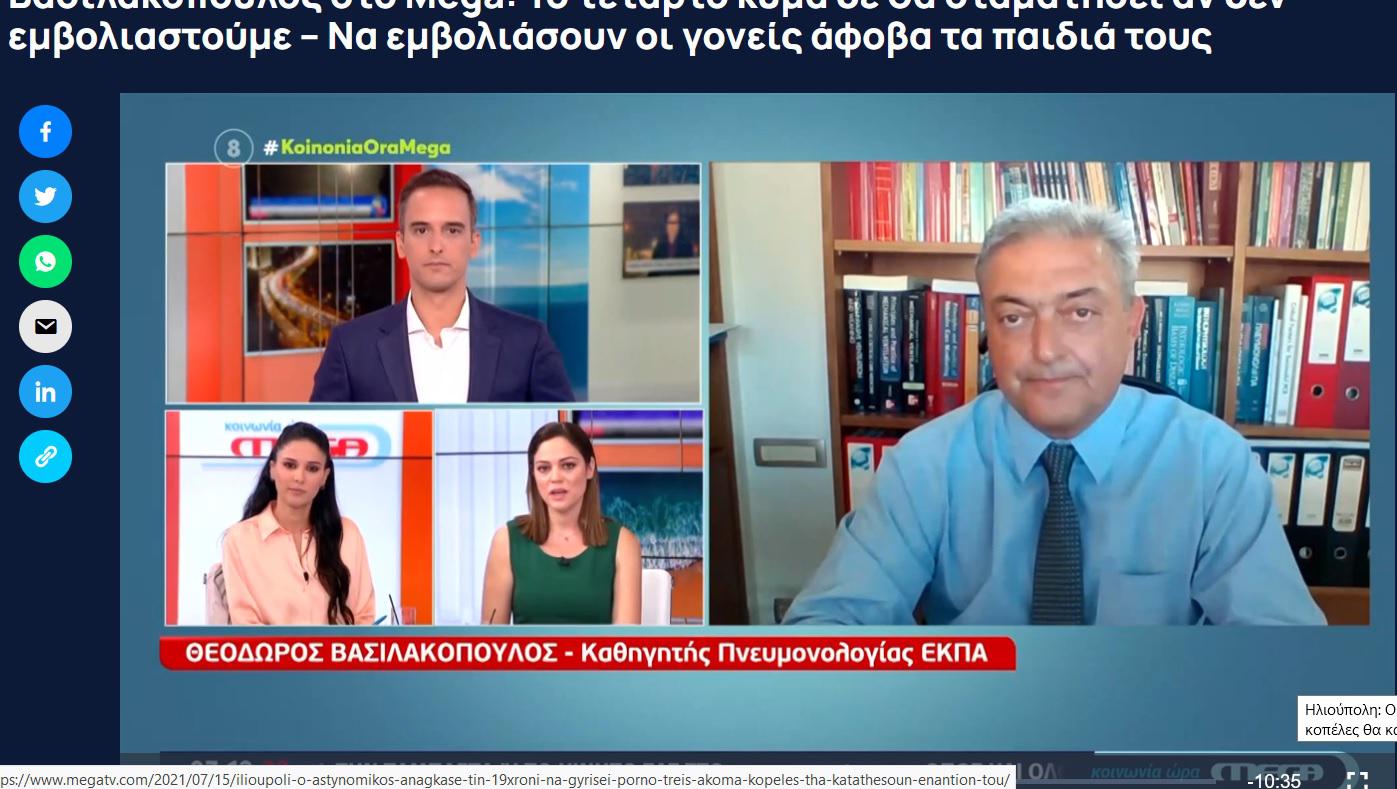 Ο μόνος τρόπος να αντιμετωπιστεί το τέταρτο κύμα της πανδημίας είναι ο εμβολιασμός, ξεκαθάρισε μιλώντας στην Κοινωνία Ώρα Mega o καθηγητής πνευμονολογίας-εντατικής θεραπείας στο ΕΚΠΑ, Θεόδωρος Βασιλακόπουλος, ενώ τόνισε ότι οι γονείς πρέπει να εμβολιάσουν άφοβα τα παιδιά τους.