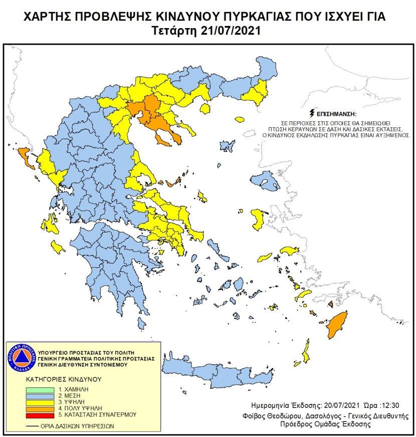 Πολύ υψηλός κίνδυνος εκδήλωσης πυρκαγιάς (κατηγορία κινδύνου 4) προβλέπεται για αύριο, Τετάρτη, 21 Ιουλίου, σε Θεσσαλονίκη, Χαλκιδική, Σποράδες, Ρόδο και Κέρκυρα.