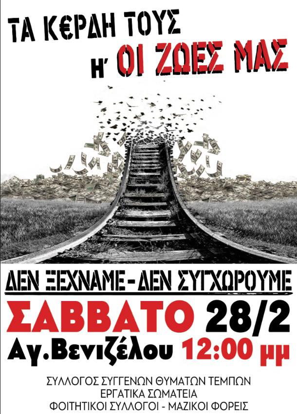 Ο Σύλλογός μας απευθύνει πλατύ κάλεσμα σε κάθε πολίτη, σε κάθε εργαζόμενο και σε κάθε νέα και νέο, κάθε γονέα, να πλημμυρίσουν τους δρόμους αυτό το Σάββατο 28/2. Ενώνουμε τις δυνάμεις μας με τα Εργατικά Κέντρα, τα Σωματεία Εργαζομένων, τους Συλλόγους Γονέων, Φοιτητών, Μαθητών και τους Μαζικούς Φορείς σε ένα κοινό μέτωπο ενάντια στη συγκάλυψη και τη λήθη.