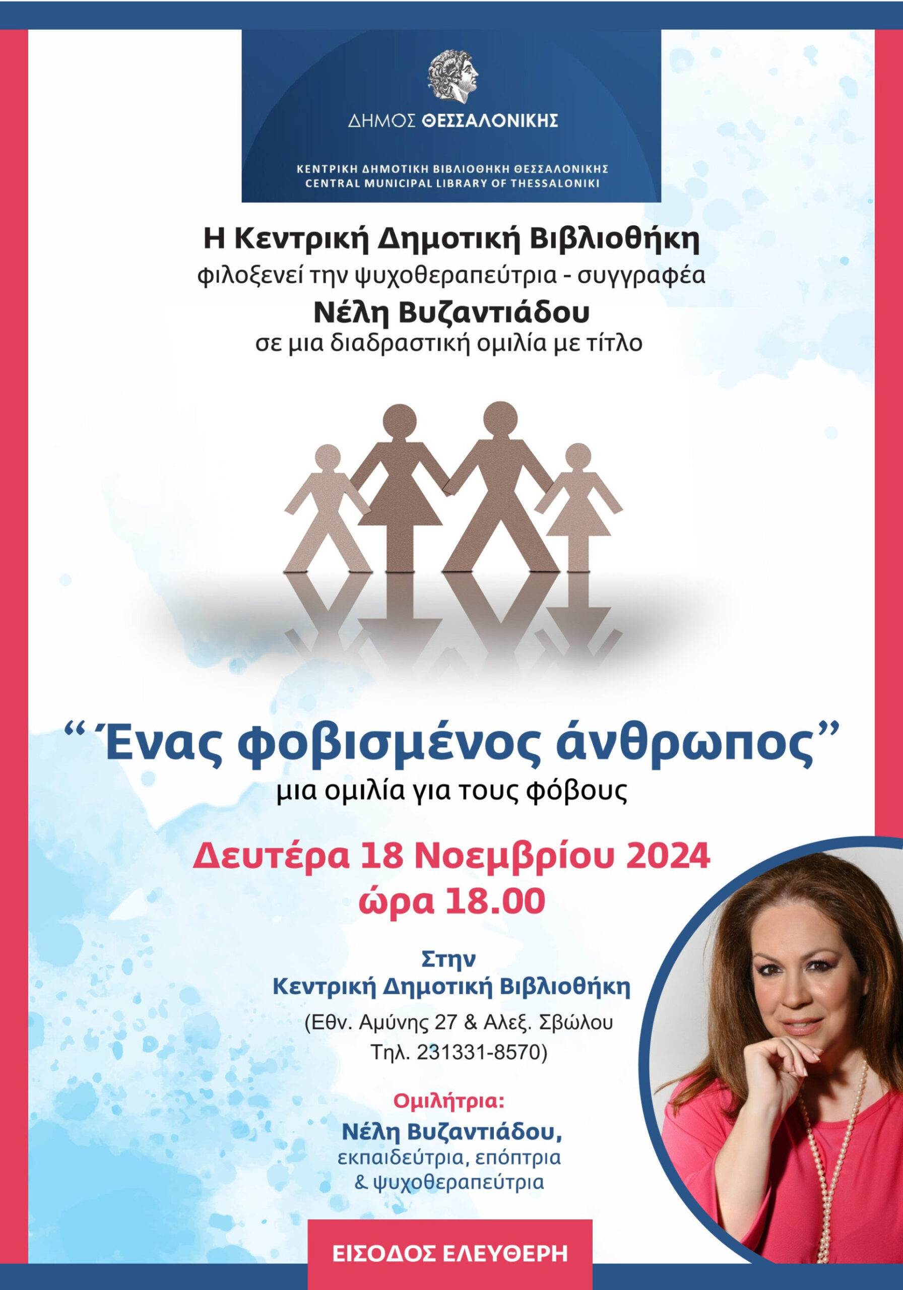 Γιατί φοβόμαστε; Πότε φοβόμαστε; Τι φοβόμαστε; Είναι φυσιολογικό να φοβόμαστε; Φοβούνται όλοι; Άλλο ο φόβος, άλλο το άγχος; Πώς επηρεάζει ο φόβος την ποιότητα της ζωής μας; Πώς να αντιμετωπίσουμε τους φόβους μας; Αυτά και πολλά άλλα θα αναπτυχθούν στην ομιλία με τίτλο «Ένας φοβισμένος άνθρωπος» που διοργανώνει η Κεντρική Δημοτική Βιβλιοθήκη Θεσσαλονίκης. Η ομιλία θα πραγματοποιηθεί τη Δευτέρα 18 Νοεμβρίου 2024 και ώρα 18.00 στην αίθουσα εκδηλώσεων της Κεντρικής Δημοτικής Βιβλιοθήκης Θεσσαλονίκης. Ομιλήτρια είναι η πιστοποιημένη ψυχοθεραπεύτρια ενηλίκων – σύμβουλος ζεύγους – εκπαιδεύτρια / συντονίστρια Σχολών Γονέων και συγγραφέας Νέλη Βυζαντιάδου.