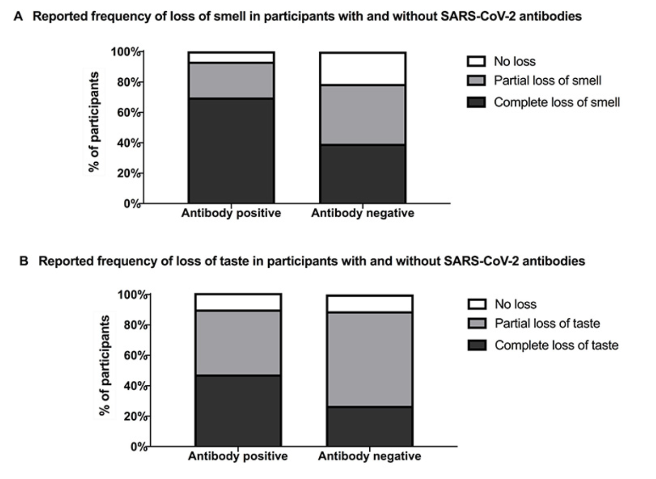 Η μελέτη βρήκε ότι τα άτομα με αιφνίδια και οξεία απώλεια όσφρησης έχουν σχεδόν τριπλάσια πιθανότητα να έχουν αντισώματα κατά του κορονοϊού, σε σχέση με όσους έχουν απώλεια γεύσης. Οι ερευνητές ανέφεραν ότι η υπερβολική έμφαση στον πυρετό και στον βήχα ως κύρια συμπτώματα της Covid-19 είναι πιθανώς εσφαλμένη και τόνισαν ότι η απώλεια όσφρησης πρέπει πλέον να αναγνωριστεί διεθνώς ως βασικό σύμπτωμα της Covid-19 και όχι ως δευτερεύον.