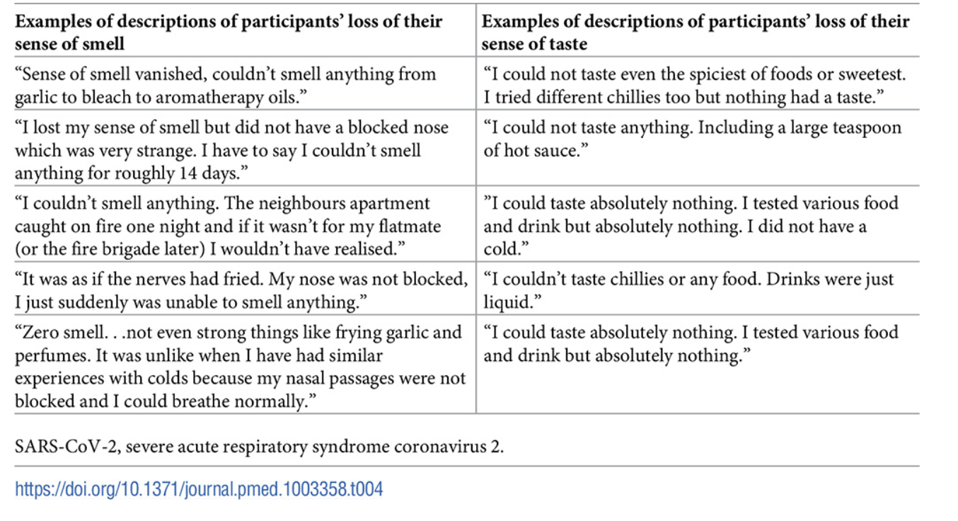 Οι ερευνητές του Πανεπιστημιακού Κολλεγίου του Λονδίνου (UCL), με επικεφαλής την καθηγήτρια Ρέιτσελ Μπάτερχαμ, οι οποίοι έκαναν τη σχετική δημοσίευση στο ιατρικό περιοδικό «PLoS Medicine», μελέτησαν 590 ανθρώπους που κατά τον προηγούμενο μήνα είχαν χάσει την όσφρηση τους ή/και τη γεύση τους και βρήκαν ότι το 78% (οι τέσσερις στους πέντε) είχαν αντισώματα έναντι του κορονοϊού SARS-CoV-2. Από όσους είχαν αντισώματα, το 40% ήταν κατά τα άλλα ασυμπτωματικοί, χωρίς καθόλου βήχα ή πυρετό.