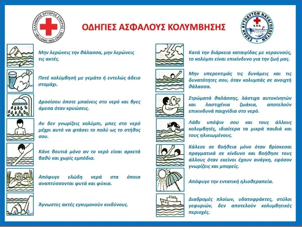 - Ποτέ μην πηγαίνετε για κολύμβηση με γεμάτο ή εντελώς άδειο στομάχι από φαγητό ή και ποτό και φροντίστε να δροσιστείτε όταν μπαίνετε στο νερό αλλά και να βγαίνετε άμεσα με το που κρυώσετε.