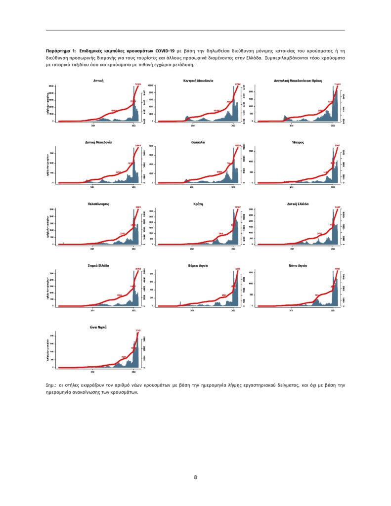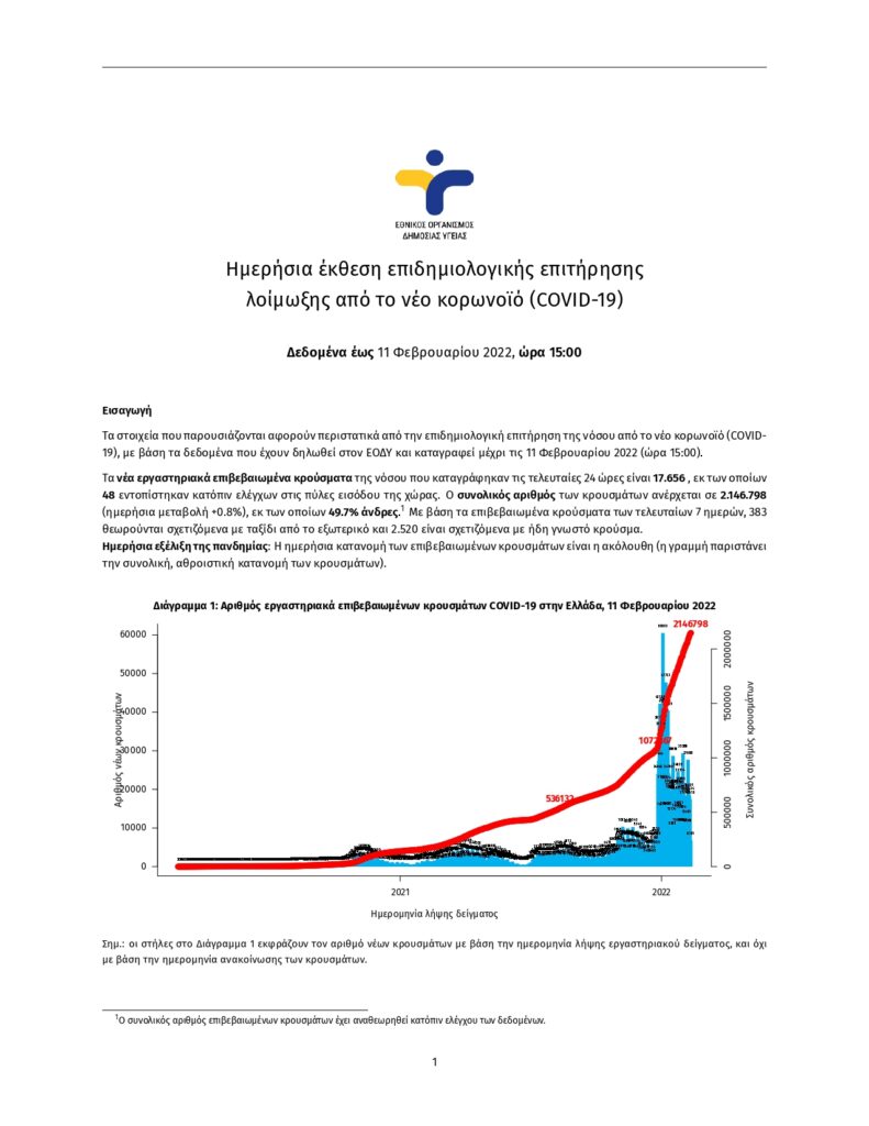 Τα στοιχεία που παρουσιάζονται αφορούν περιστατικά από την επιδημιολογική επιτήρηση της νόσου από το νέο κορωνοϊό (COVID- 19), με βάση τα δεδομένα που έχουν δηλωθεί στον ΕΟΔΥ και καταγραφεί μέχρι τις 11 Φεβρουαρίου 2022 (ώρα 15:00).