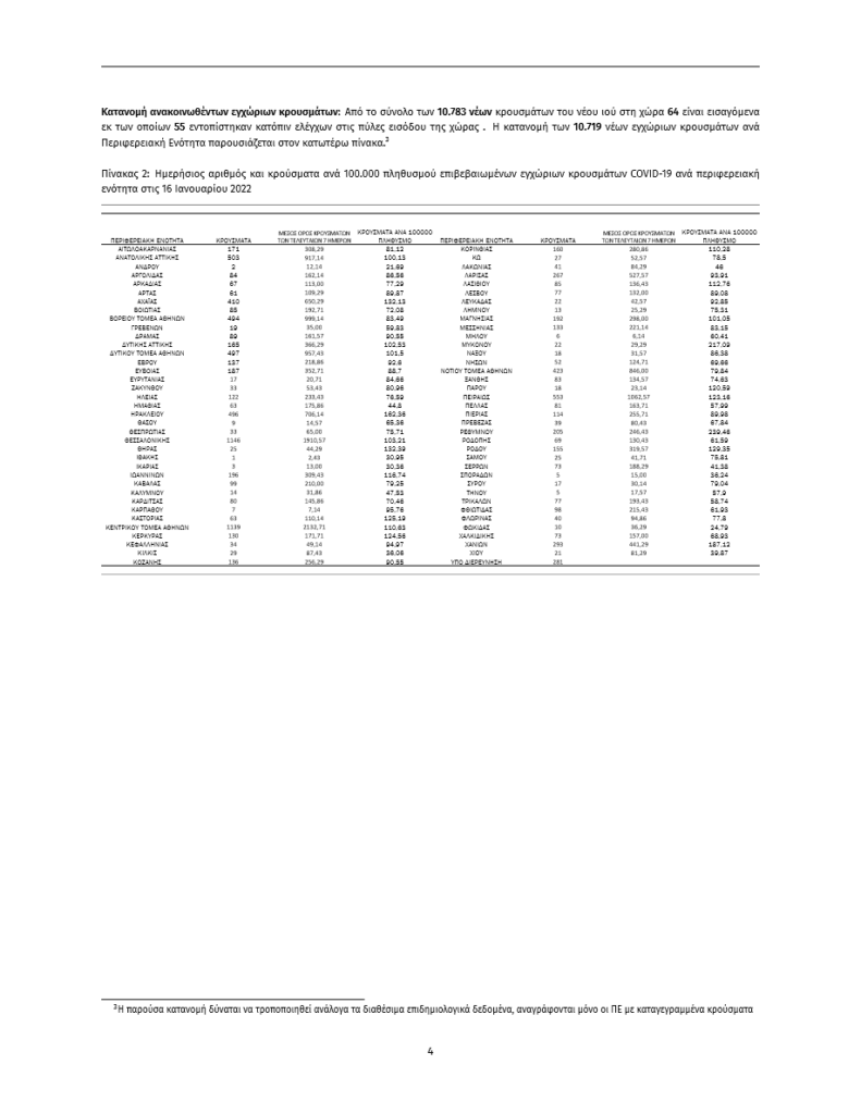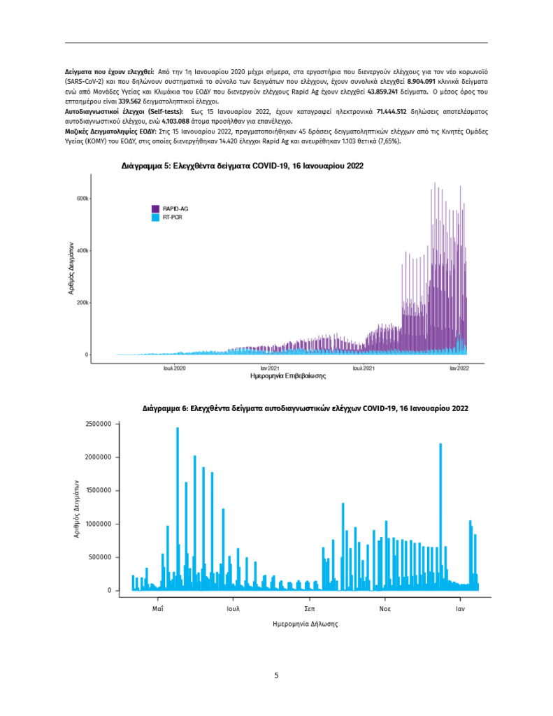 Τα στοιχεία που παρουσιάζονται αφορούν περιστατικά από την επιδημιολογική επιτήρηση της νόσου από το νέο κορωνοϊό (COVID- 19), με βάση τα δεδομένα που έχουν δηλωθεί στον ΕΟΔΥ και καταγραφεί μέχρι τις 16 Ιανουαρίου 2022 (ώρα 15:00).
