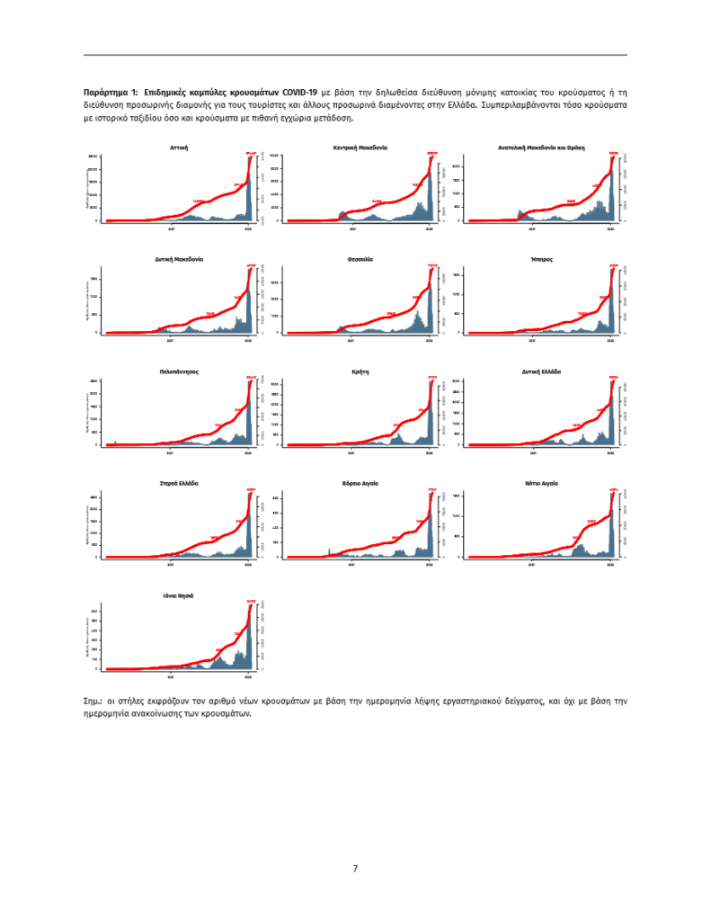 Τα νέα εργαστηριακά επιβεβαιωμένα κρούσματα της νόσου που καταγράφηκαν τις τελευταίες 24 ώρες είναι 10.783 , εκ των οποίων 55 εντοπίστηκαν κατόπιν ελέγχων στις πύλες εισόδου της χώρας. Ο συνολικός αριθμός των κρουσμάτων ανέρχεται σε 1.660.871 (ημερήσια μεταβολή +0.7%), εκ των οποίων 49.8% άνδρες. Με βάση τα επιβεβαιωμένα κρούσματα των τελευταίων 7 ημερών, 506 θεωρούνται σχετιζόμενα με ταξίδι από το εξωτερικό και 2.146 είναι σχετιζόμενα με ήδη γνωστό κρούσμα.