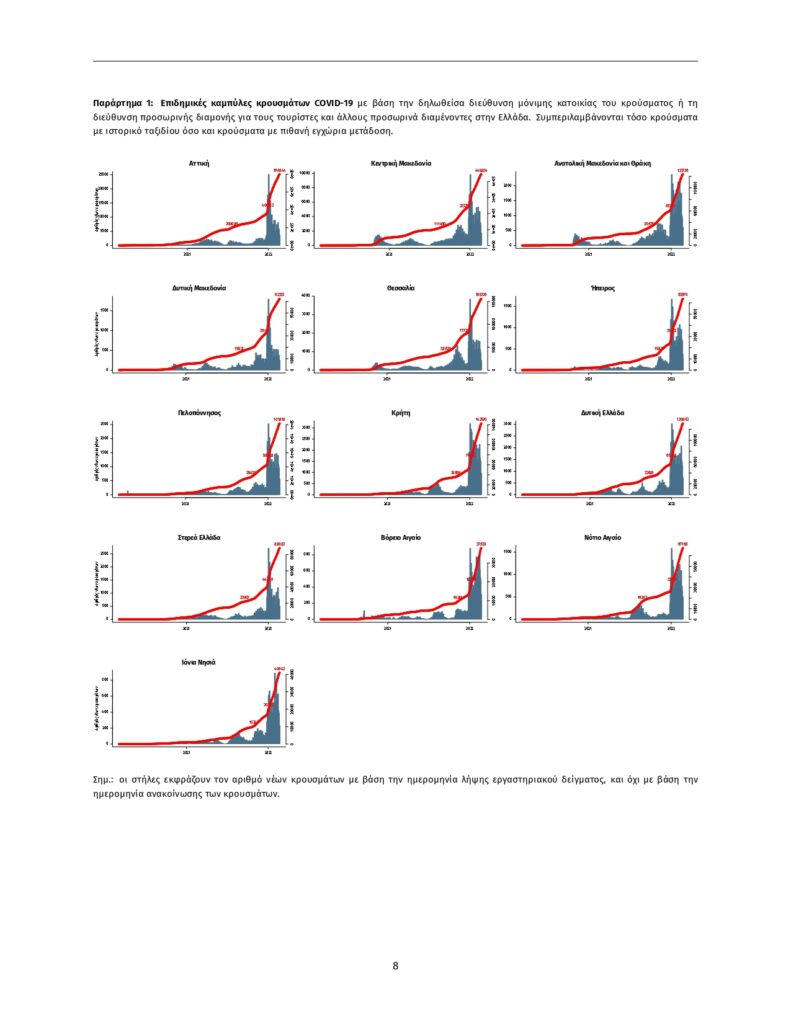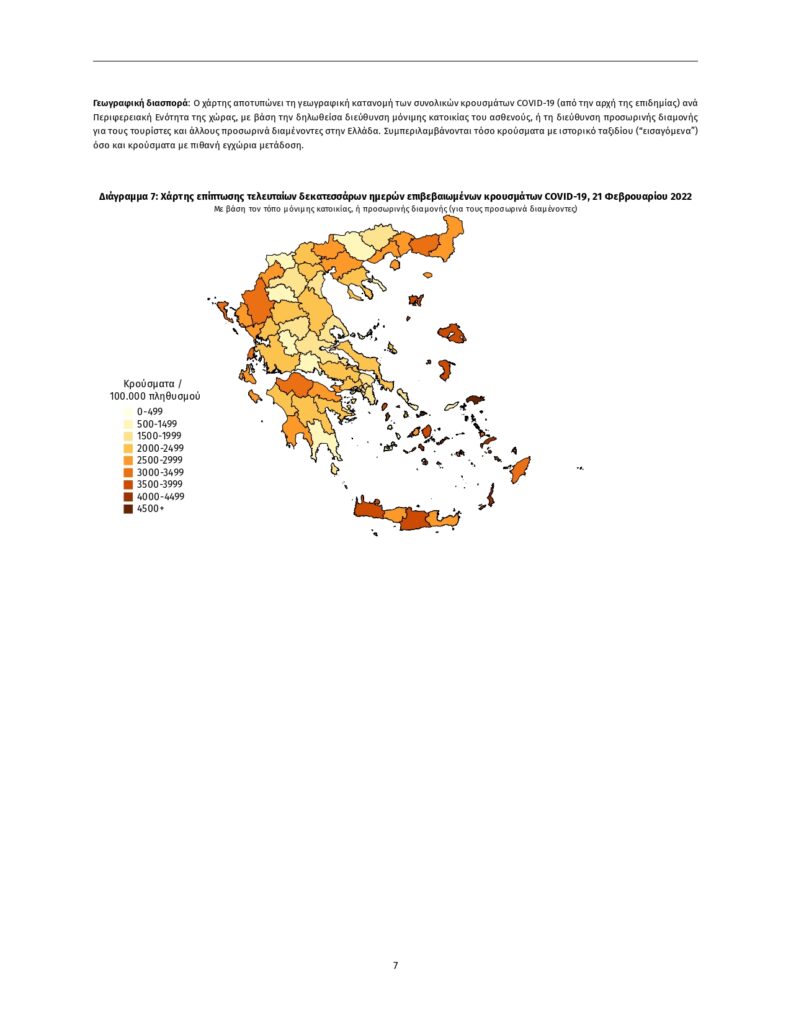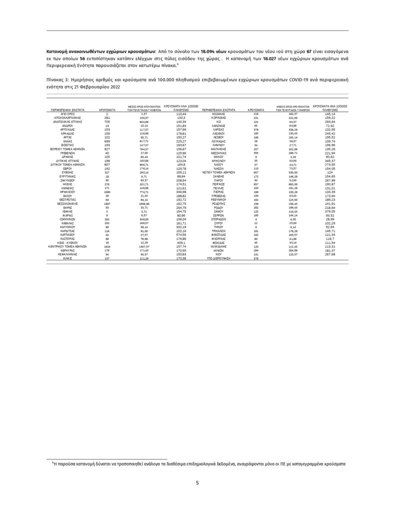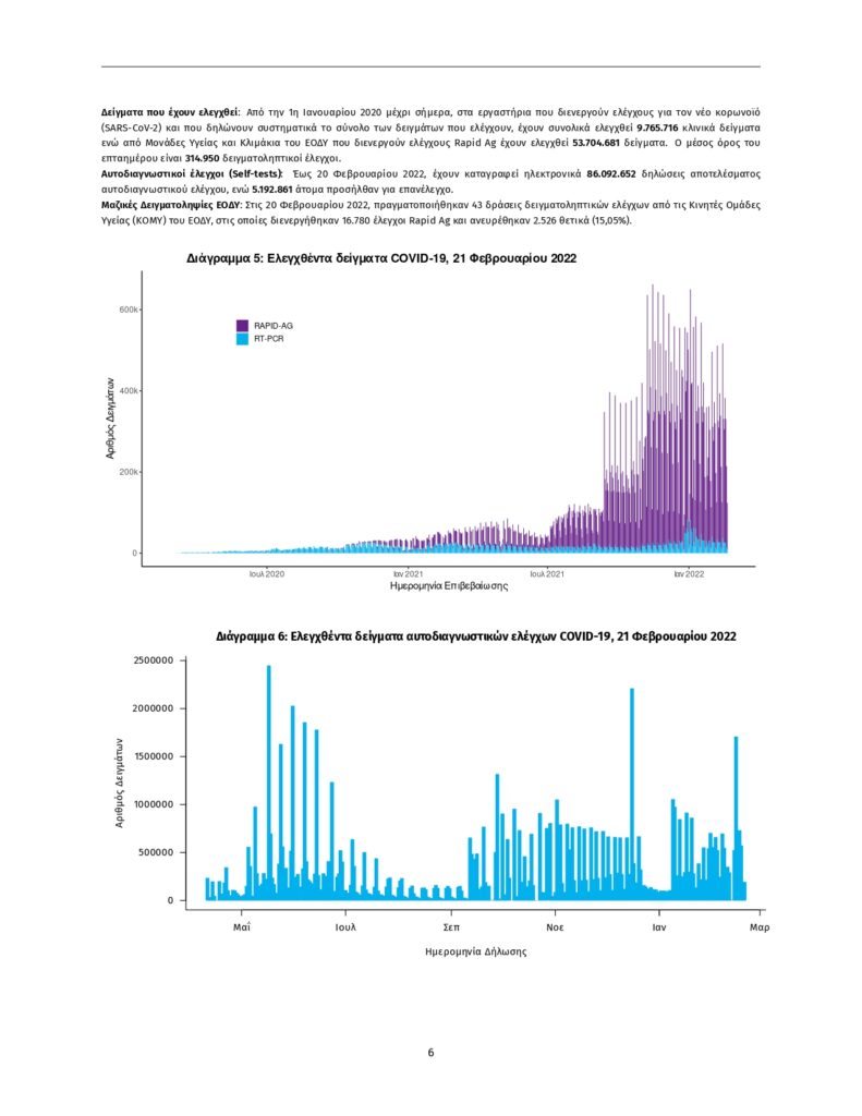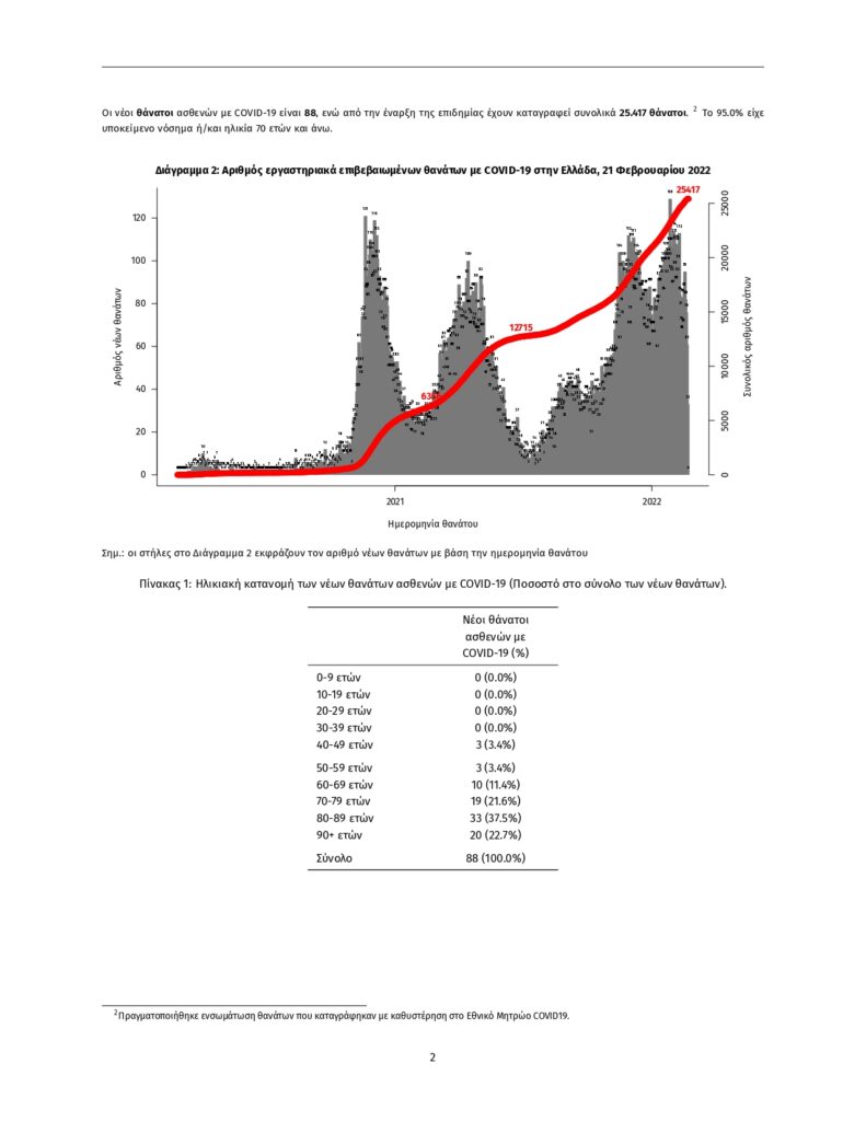«Τα νέα εργαστηριακά επιβεβαιωμένα κρούσματα της νόσου που καταγράφηκαν τις τελευταίες 24 ώρες είναι 18.094 , εκ των οποίων 56 εντοπίστηκαν κατόπιν ελέγχων στις πύλες εισόδου της χώρας. Ο συνολικός αριθμός των κρουσμάτων ανέρχεται σε 2.317.014 (ημερήσια μεταβολή +0.8%), εκ των οποίων 49.6% άνδρες. Με βάση τα επιβεβαιωμένα κρούσματα των τελευταίων 7 ημερών, 288 θεωρούνται σχετιζόμενα με ταξίδι από το εξωτερικό και 2.024 είναι σχετιζόμενα με ήδη γνωστό κρούσμα.