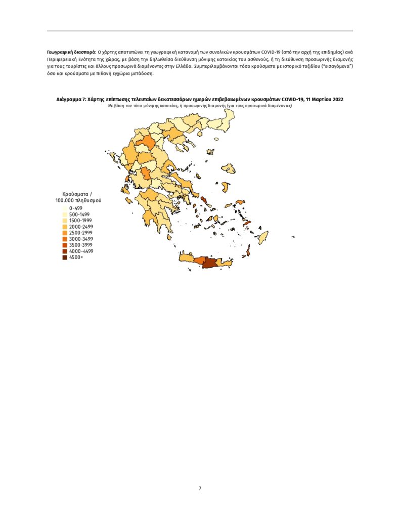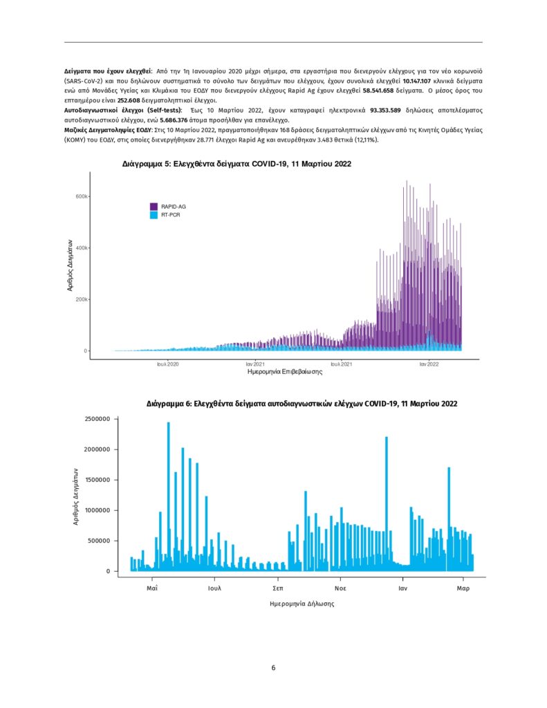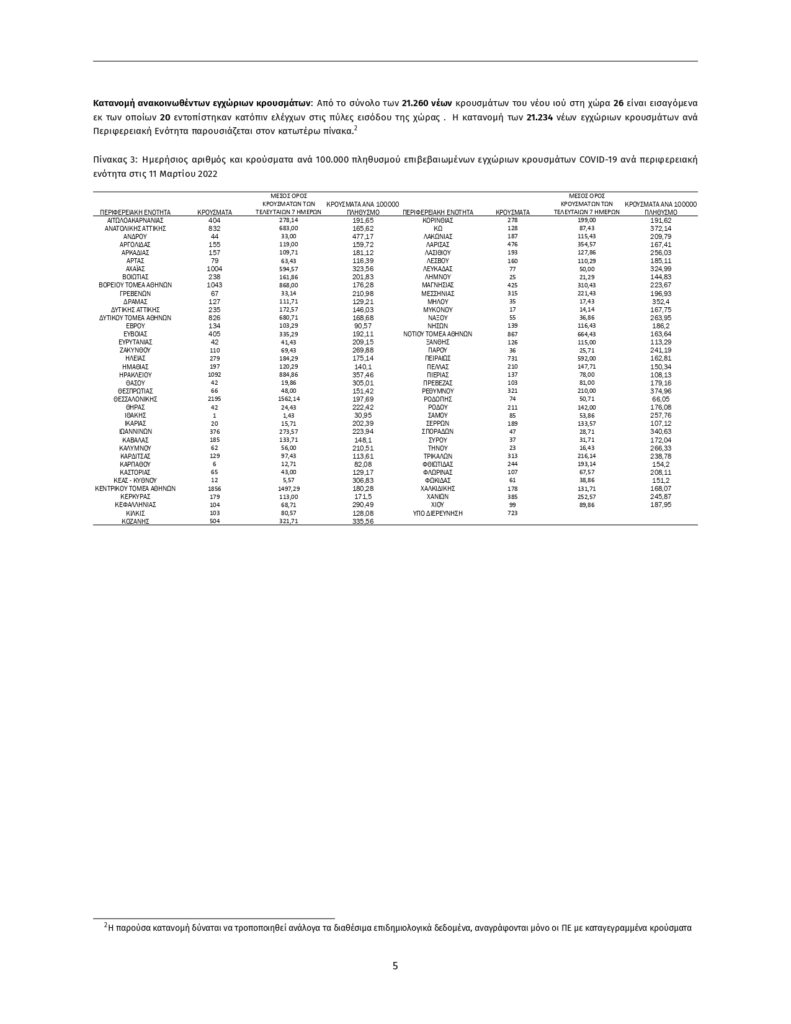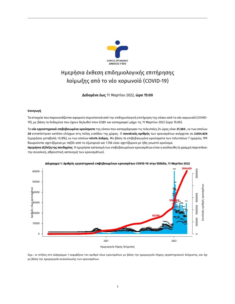 Τα στοιχεία που παρουσιάζονται αφορούν περιστατικά από την επιδημιολογική επιτήρηση της νόσου από το νέο κορωνοϊό (COVID- 19), με βάση τα δεδομένα που έχουν δηλωθεί στον ΕΟΔΥ και καταγραφεί μέχρι τις 11 Μαρτίου 2022 (ώρα 15:00). Τα νέα εργαστηριακά επιβεβαιωμένα κρούσματα της νόσου που καταγράφηκαν τις τελευταίες 24 ώρες είναι 21.260 , εκ των οποίων 20 εντοπίστηκαν κατόπιν ελέγχων στις πύλες εισόδου της χώρας. Ο συνολικός αριθμός των κρουσμάτων ανέρχεται σε 2.604.626 (ημερήσια μεταβολή +0.8%), εκ των οποίων 49.4% άνδρες. Με βάση τα επιβεβαιωμένα κρούσματα των τελευταίων 7 ημερών, 199 θεωρούνται σχετιζόμενα με ταξίδι από το εξωτερικό και 1.156 είναι σχετιζόμενα με ήδη γνωστό κρούσμα.