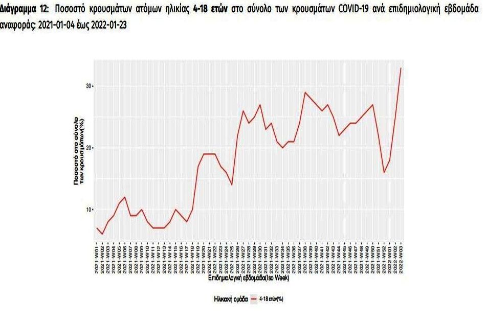 Σύμφωνα με τον Εθνικό Οργανισμό Δημόσιας Υγείας, την εβδομάδα 17-23 Ιανουαρίου 2022, το σύνολο των ασθενών ηλικίας 4-18 ετών ήταν 43.156, αποτελώντας το 33% στο σύνολο των κρουσμάτων.