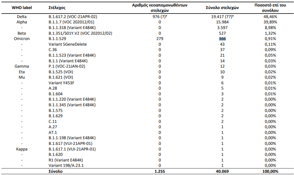 Επιπλέον, έχουν απομονωθεί συνολικά 532 στελέχη ειδικού ενδιαφέροντος ή υπό παρακολούθηση ή ενδιαφέροντος από δείγματα εισαγόμενων κρουσμάτων, εκ των οποίων 324 αφορούν στο Delta, 113 στο Alpha, 74 στο Omicron, 7 στο Mu, 6 στο Beta, 4 στο B.1.1.318 (Variant E484K), 1 στο Eta, 1 στο C.36, 1 στο Kappa, και 1 στο B.1.1 (Variant E484K). ».