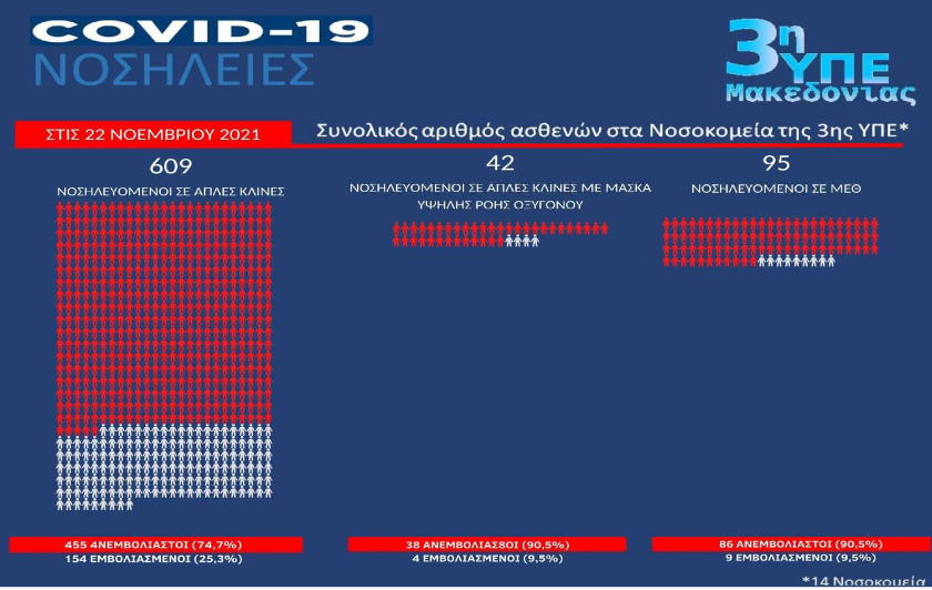 Σε ότι αφορά τα ποσοστά εμβολιασμένων και ανεμβολίαστων στους ασθενείς με κορονοϊο στα νοσοκομεία της Β Ελλάδας, τα στοιχεία που δόθηκαν χθες από τις δύο Υγειονομικές Περιφέρειες, στις οποίες ανήκουν διοικητικά όλα τα νοσοκομεία της Μακεδονίας και της Θράκης είναι διαφωτιστικά. Στις απλές κλινικές covid, πάνω από το 75% είναι ανεμβολίαστοι και στις ΜΕΘ το ποσοστό υπερβαίνει το 90%.