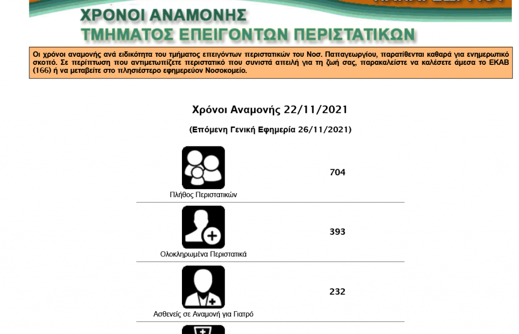 Τα εξωτερικά ιατρεία της εφημερίας θύμιζαν σχεδόν ζώνη πολέμου καθώς εκατοντάδες άνθρωποι βρισκόταν σε αναμονή να εξεταστούν, με το 40% περίπου να αφορά λοιμώξεις και δη περιστατικά covid. Γύρω στα μεσάνυχτα υπήρχαν 232 άτομα σε αναμονή να εξεταστούν, με μέσο χρόνο αναμονής τις 3 ώρες.