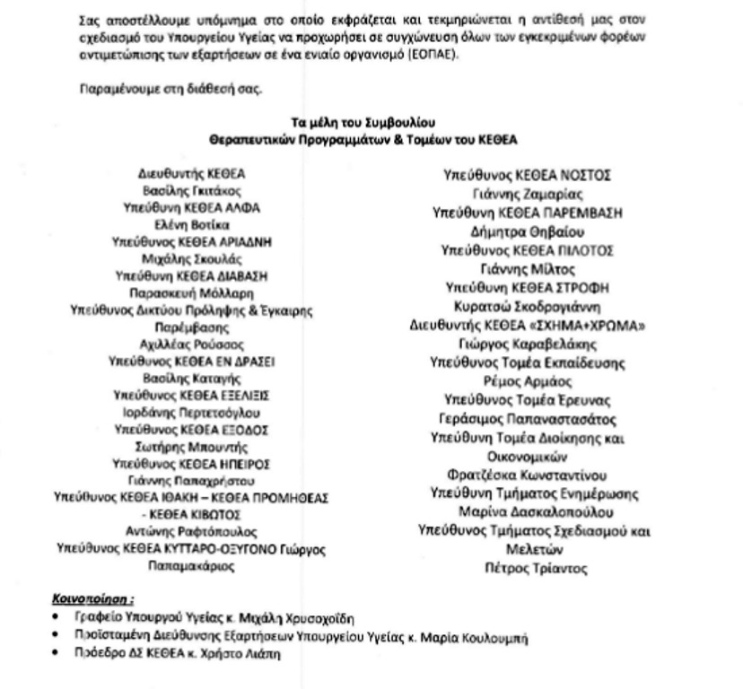 Διαβάστε όλο το υπόμνημα εδώ: Υπεύθυνοι τομέων και προγραμμάτων του ΚΕΘΕΑ – ΥΠΟΜΝΗΜΑ